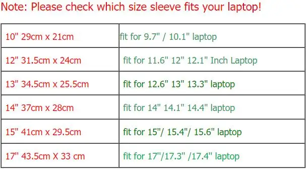Примечание: Пожалуйста, проверьте, какой размер рукава подходит вашему ноутбуку!