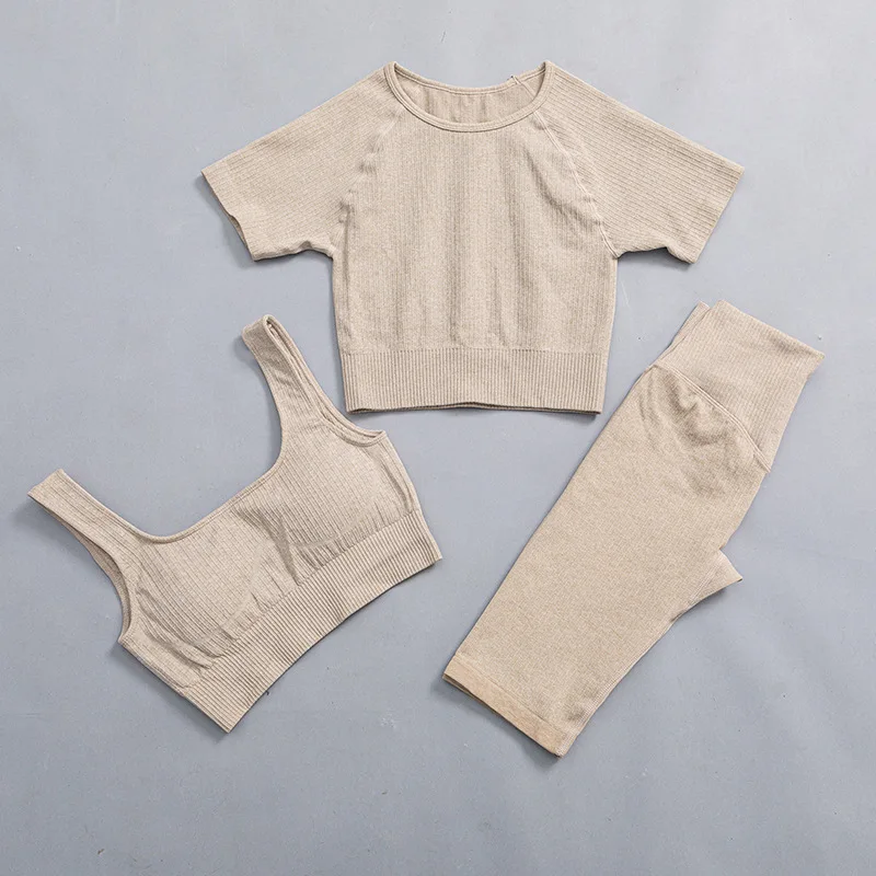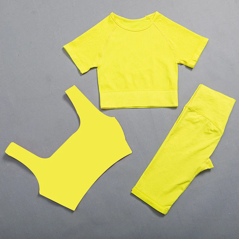Женские Бесшовные комплекты для йоги, 3 шт., женская одежда для фитнеса, спортивный костюм, спортивный бюстгальтер для тренажерного зала, короткий топ, шорты для йоги с коротким рукавом, комплект для тренировок