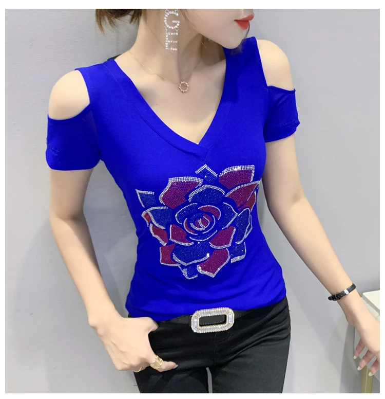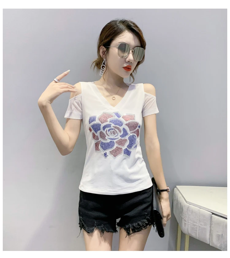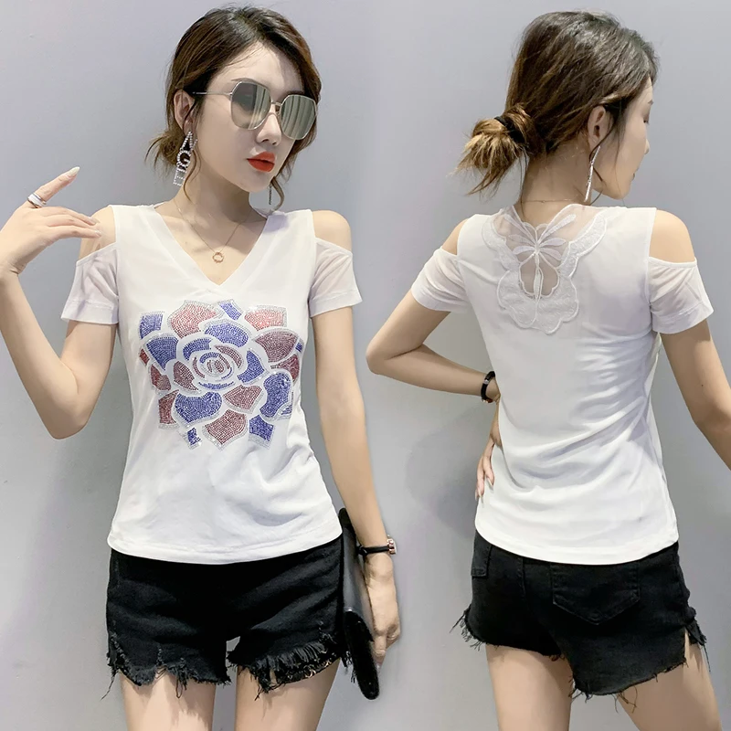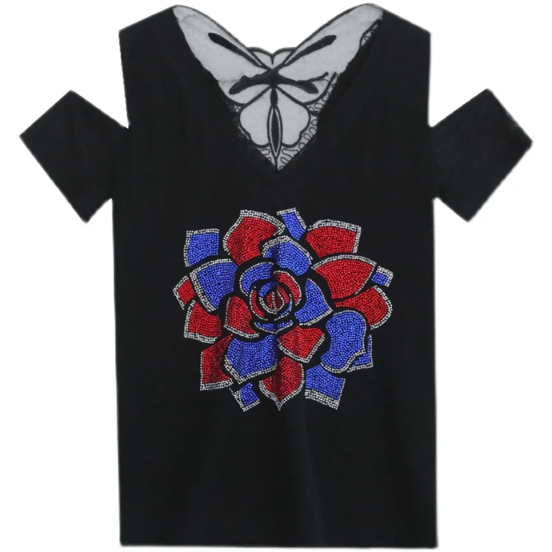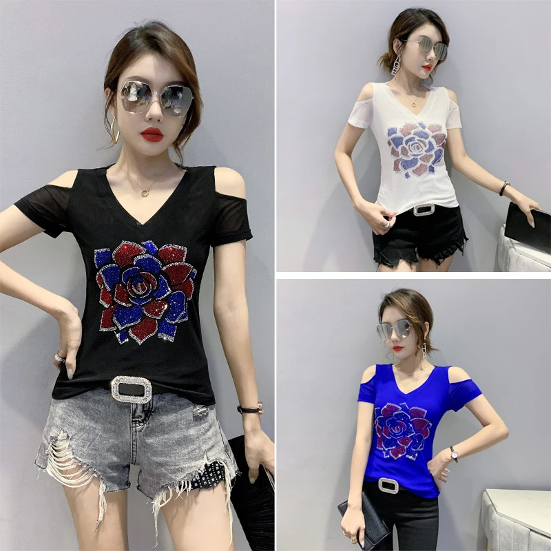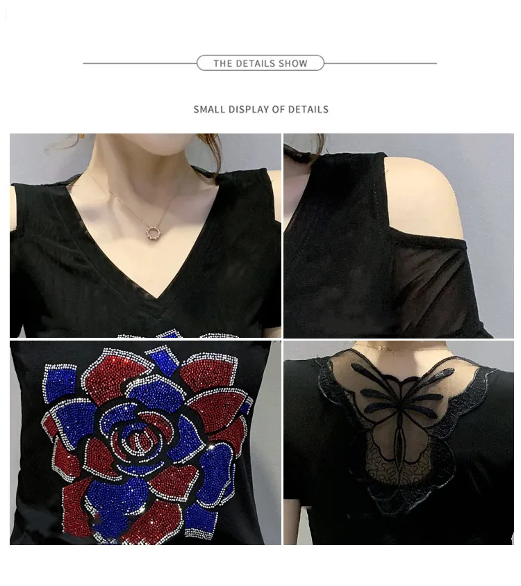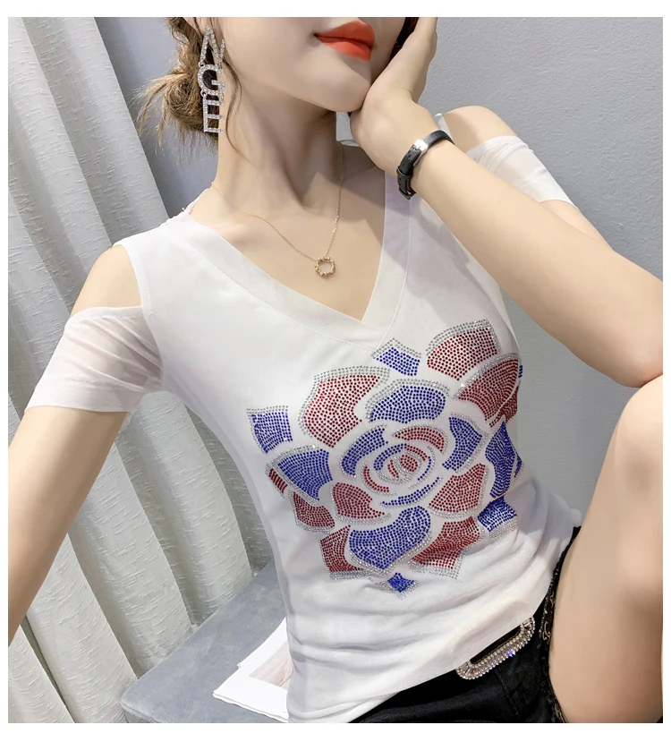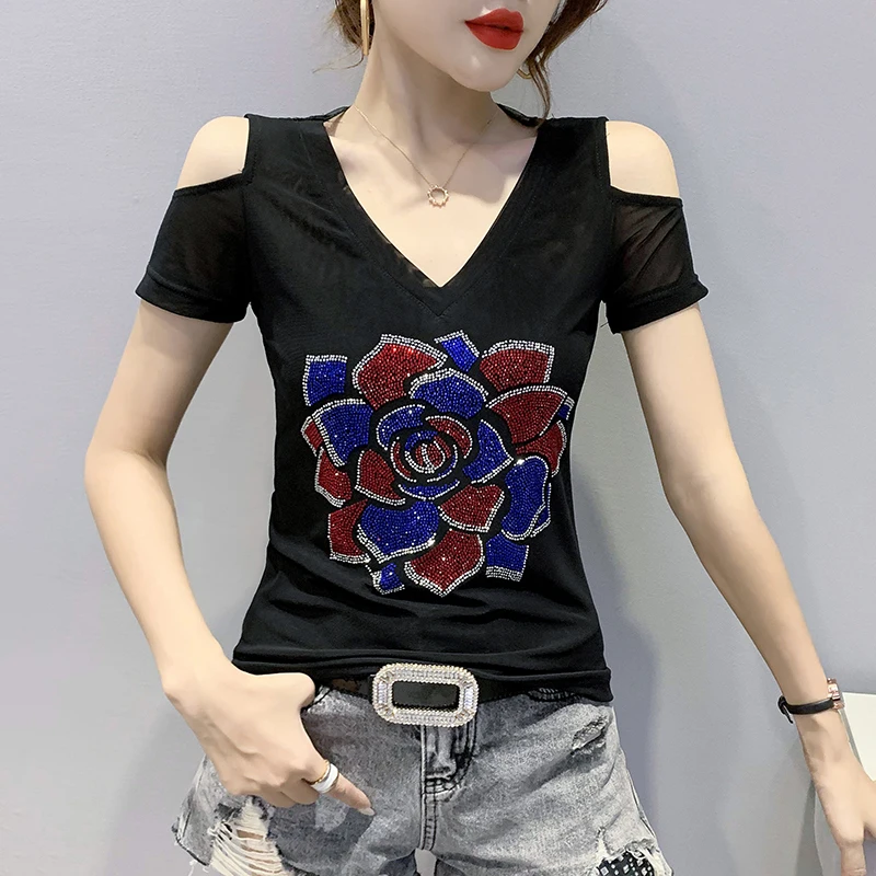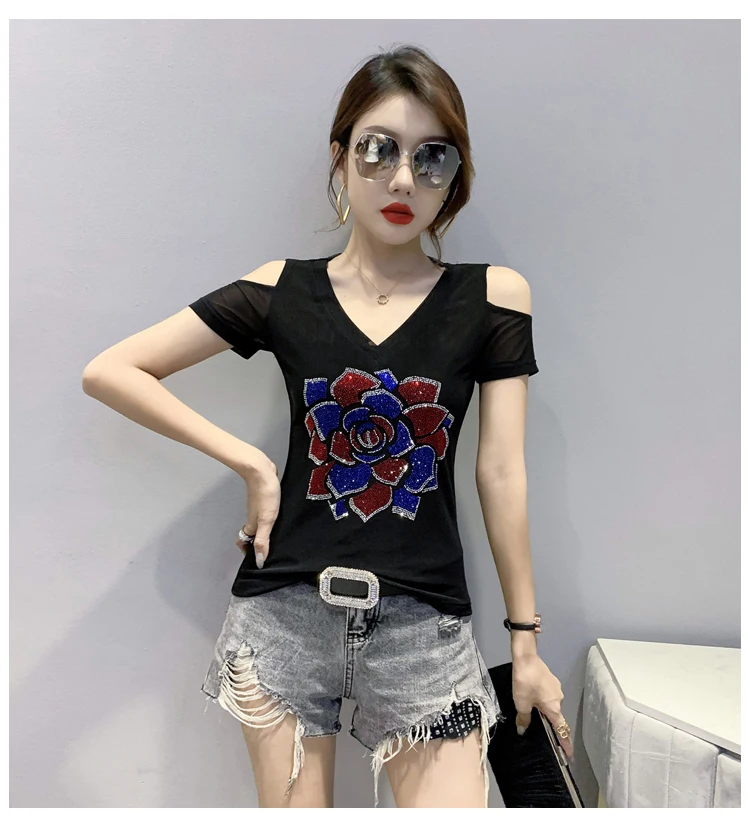 Женская Сетчатая футболка с открытыми плечами, V-образным вырезом и блестящими розами