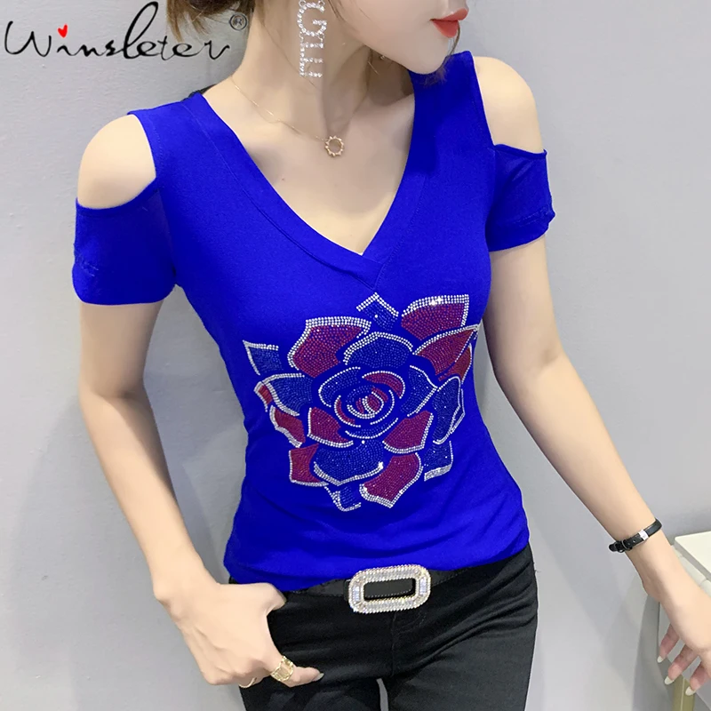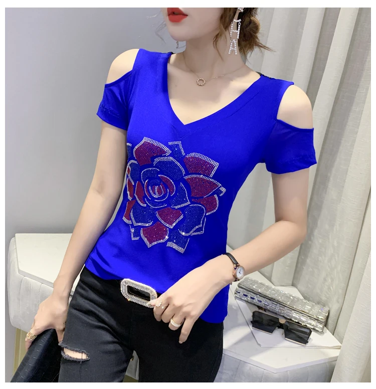 Летняя европейская одежда, Сетчатая футболка, шикарные сексуальные топы с открытыми плечами и V-образным вырезом, блестящие Ромбы, женские топы, футболки с коротким рукавом 2021 T15723A