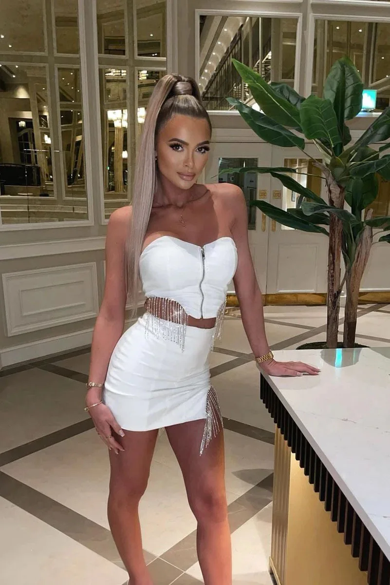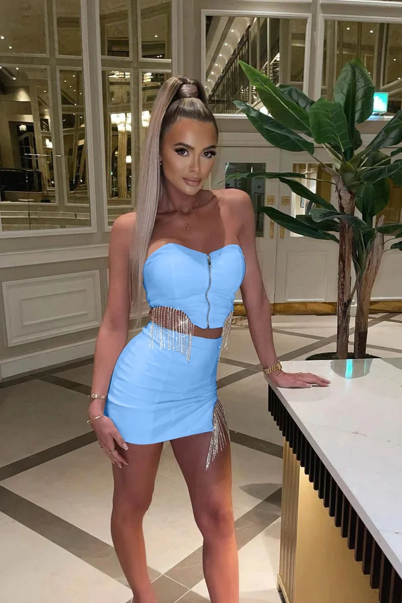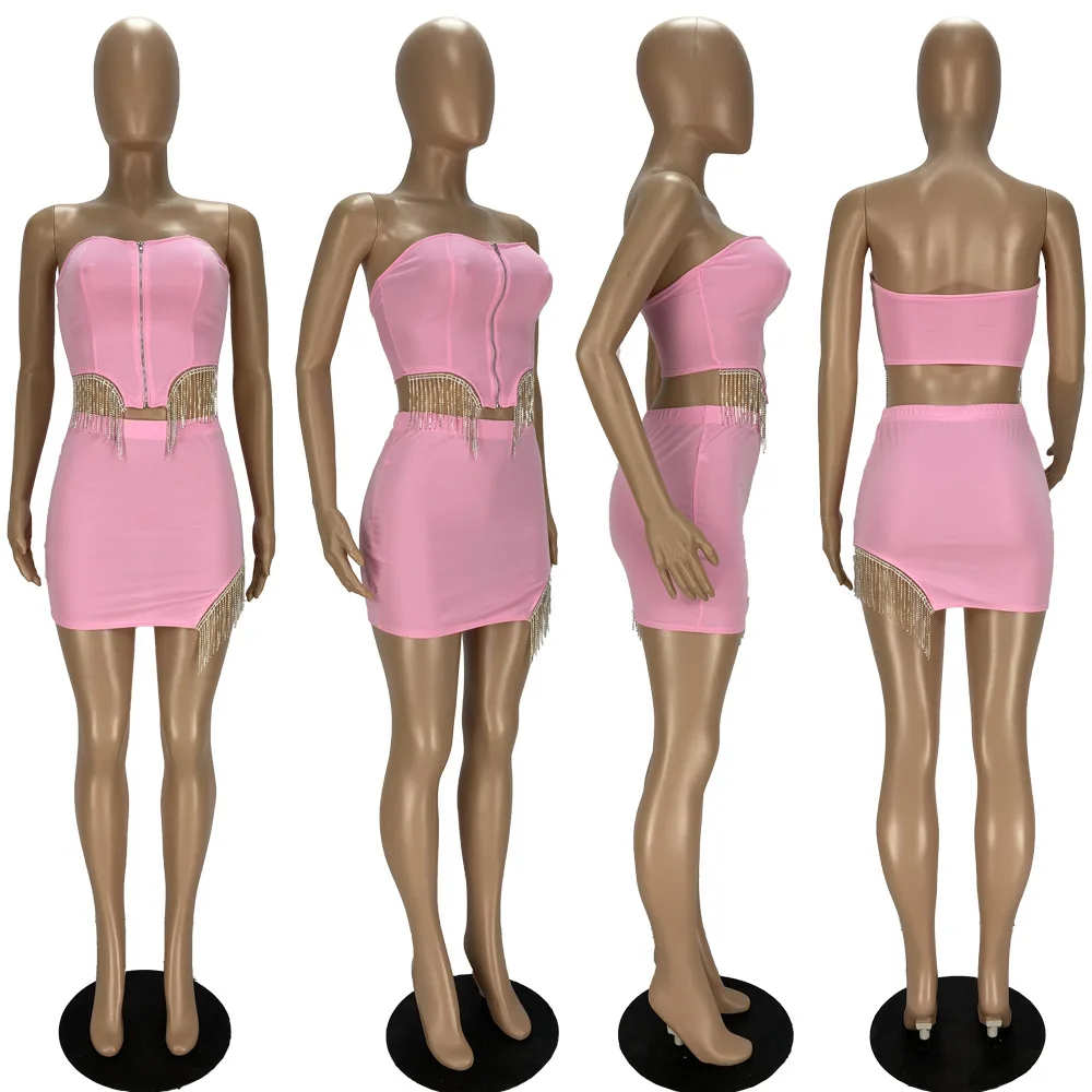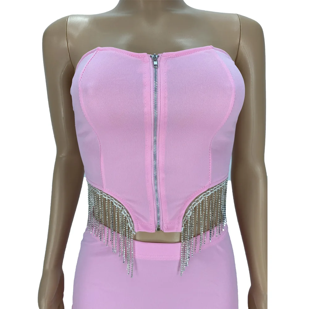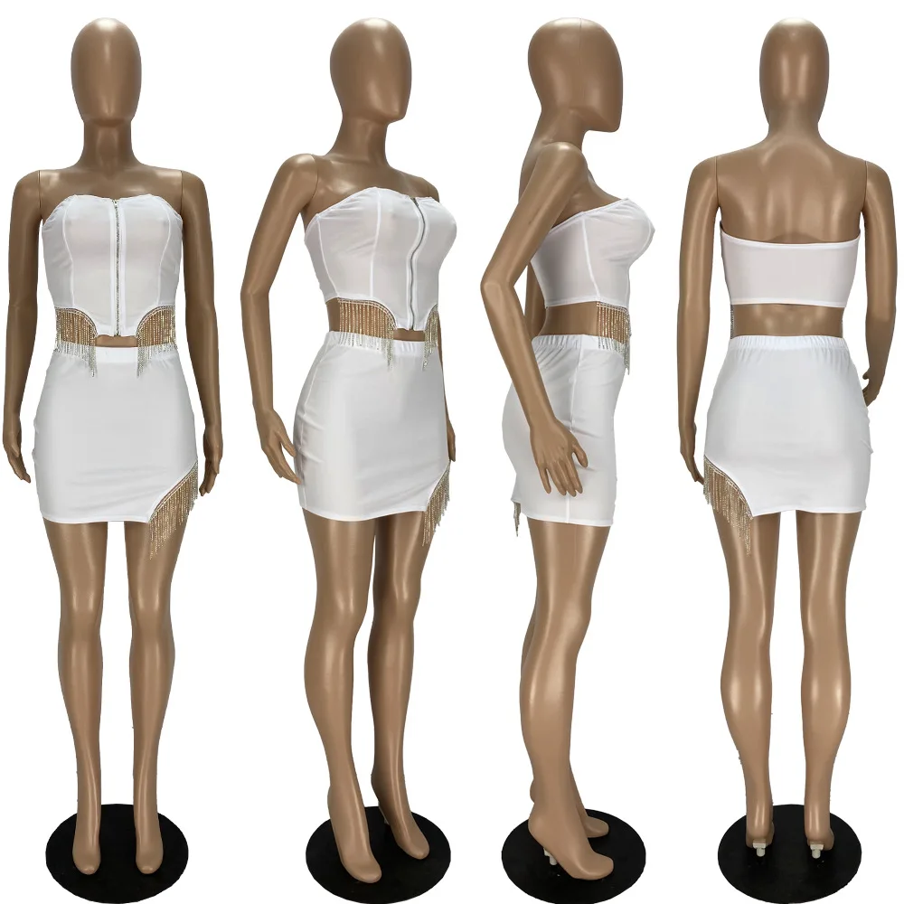 Соблазнительная уличная одежда Стразы юбки с бахромой комплект из 2 предметов короткий топ на молнии с открытыми плечами + мини-юбка комплект из двух предметов платье