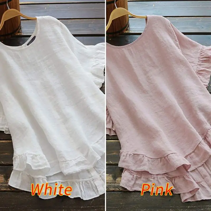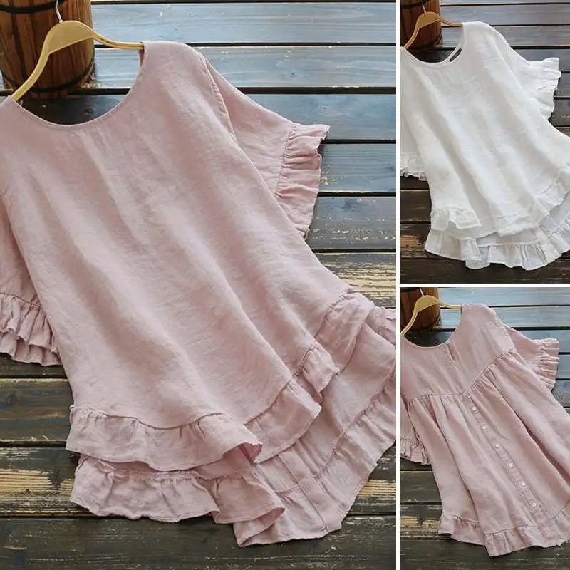 Тип товара: блузкаМатериал: 100% хлопокЦвета: розовый, белыйРазмер: S,M,L,XL,2XL,Посылка входит: 1 блузкаТип Посадки: свободныйВоротник: круглый вырезСтиль рукава: рукав с оборкамиДлина рукава: средний рукавТип застежки: пуговицыУзор: однотонныйТолщина: СтандартнаяСтиль: ПовседневныйСезон: весна, лето, осеньПовод: ежедневно