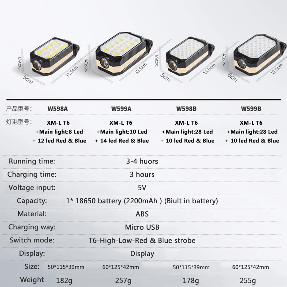Параметры продуктаБренд: LitwodМодель: W598 + W599Тип AШарик лампы: T6 + 8COB + 12SMD2835 красный и синий фитильРазмер изделия: 50*115*39 мм (маленький)/60*125*42 мм (большой)Вес: 182 г/257 гМатериал изделия: абс + нейлонСпособ зарядки: зарядка через USBВремя зарядки: 3 часаЕмкость аккумулятора: встроенный аккумулятор 18650 2200 мАчВремя выдержки: 3-5 часовДисплей питания: боковой дисплей зарядаТип BШарик лампы: T6 + 28SMD2835 + 10SMD2835 красный и синий фитильРазмер изделия: 50*115*39 мм (маленький)/60*125*42 мм (большой)Вес: 178 г/255 гМатериал изделия: абс + нейлонСпособ зарядки: зарядка через USBВремя зарядки: 3 часаЕмкость аккумулятора: встроенный аккумулятор 18650 2200 мАчВремя выдержки: 3-5 часовДисплей питания: боковой дисплей зарядаОсобенности1: продукт имеет индикатор питания, вы всегда можете узнать оставшуюся батарею.2: есть мощные магниты на дне, вы можете прилипать к любой железной поверхности.3: Нижняя рама может быть превращена в крючок и может быть подвешена во многих местах.4. Оснащен чередующимися красными и синими огнями, которые могут использоваться в качестве предупреждающих огнейЧто в посылкаВы можете выбрать различные модели и различные размеры рабочих огней в соответствии с вашими потребностями, и соответствующие аксессуары доступны для покупки.