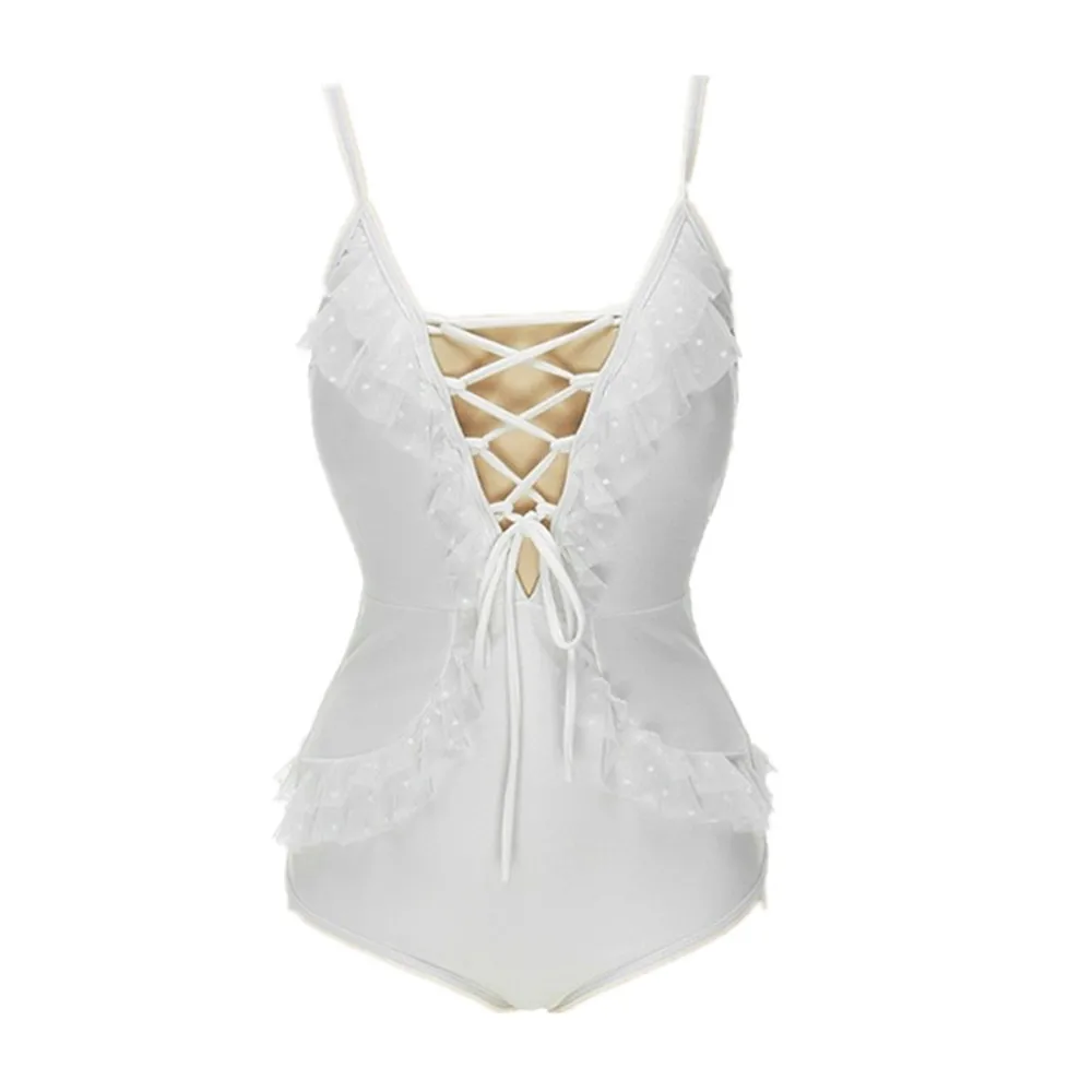 Сексуальный кружевной цельный купальный костюм, женский однотонный белый купальник на шнуровке, монокини с оборками, купальный костюм с открытой спиной, бандажный купальник на бретелях
