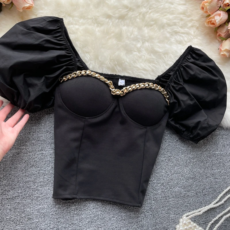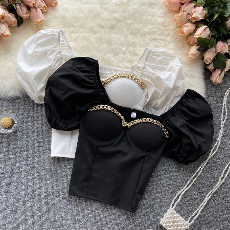Блузка женская, однотонная, с коротким рукавом, с цепочкой, S803