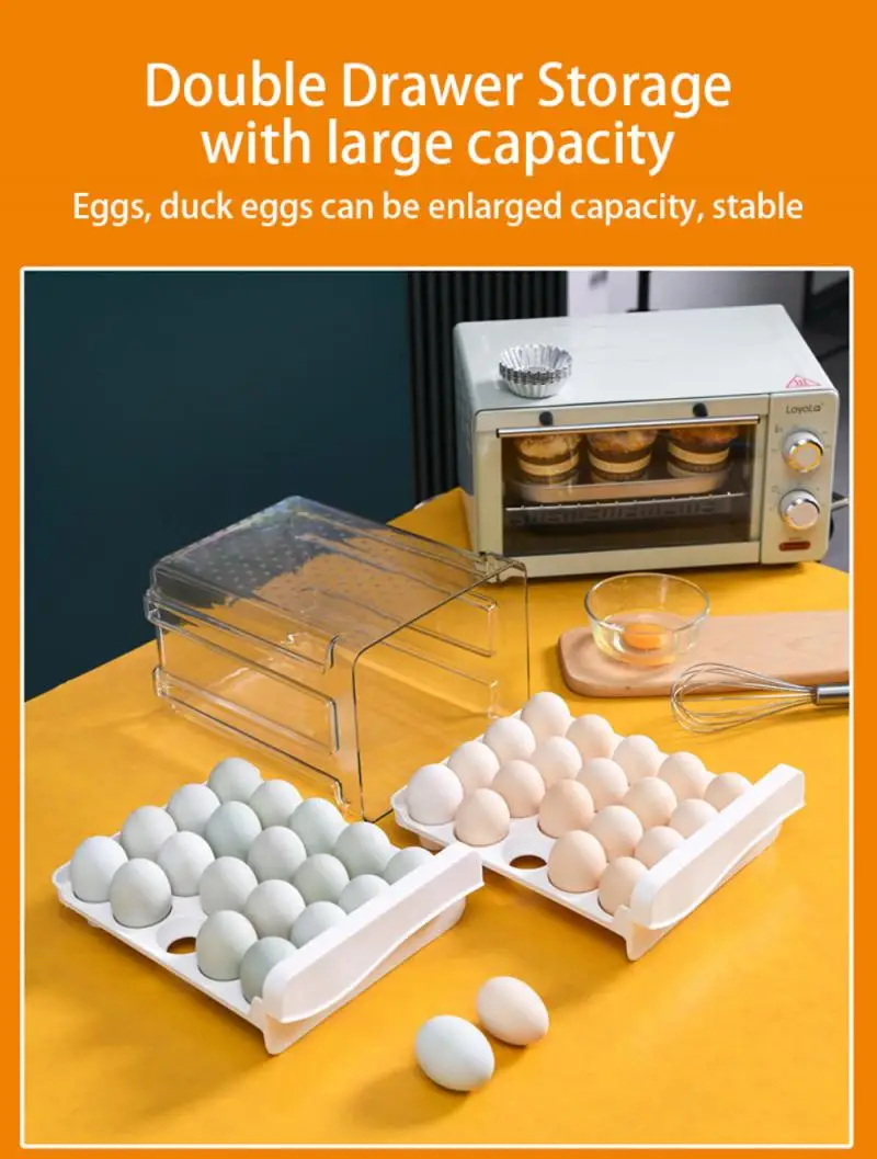 2. Большая емкость: двухслойная конструкция, Емкость: 15 л, количество яиц: 60 (30 на слой), что позволяет сэкономить много места и сохранить свежесть, дизайн с канавками, каждое яйцо размещается отдельно.