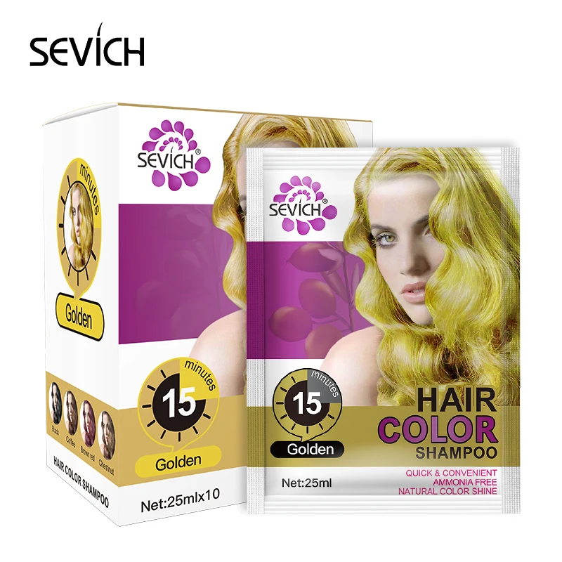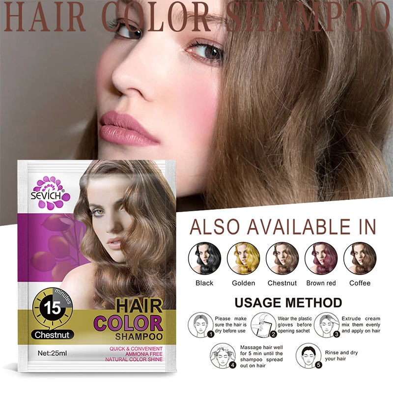 Окрашивающий шампунь для волос-это такой вид шампуня, который окрашивает волосы за 15-25 минут и специально предназначен для того, чтобы придать блеск вашим волосам во время обычного процесса мытья волос в ванной комнате.Окрашивающий шампунь для волос Sevich не токсичен и высокотехнологичен. Также он питает, защищает и восстанавливает кожу головы. По сравнению с обычной краской этот шампунь обладает преимуществом низкой цены и экономии времени.1 УдобноПрост в обращении. Перед тем как открыть упаковку, наденьте пластиковые перчатки. Втирайте несколько минут, как обычный шампунь.2. Экономия времениОдин раз использования придаст блеск окрашенных волос через 1:-25 минут.3. Экономия средствПо сравнению с высокими ценами окрашивания в салоне черный шампунь для волос более чем в 10 раз дешевле.4. Бесплатные пластиковые перчаткиОкрашивают волосы за 15-25 минут.Легко красить, легко смывать.Стойкая, быстродействующая краска для волосМода! Легко! Удобно! Станьте другой собой!Осторожно:1. Избегайте контакта с глазами.2. Только для наружного использования.3. Храните в недоступном для детей месте.Этот продукт представлен в черном, золотистом, каштановом, коричнево-рыжем и кофейном оттенках. Если после первой попытки эффект окрашивания не достигнут, попробуйте еще раз и подождите 15-25 минут не смывая.