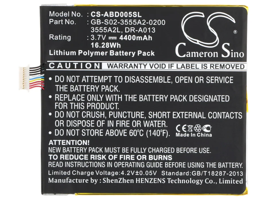 Артикул: CS-ABD005SL Бренд: Amazon Модель: D01400, kindle Fire Часть №: 3555A2L, DR-A013, E3GU111L2002, GB-S02-3555A2-0200, QP01 Категории: планшет Емкость: 4400 мАч/16,28 Вт · ч Тип: литий-полимерный Вольт: 3,7 Цвет: черный Размеры: 116,10x108,40x3,80 мм GrossWeight:231 Вес нетто: 91,0