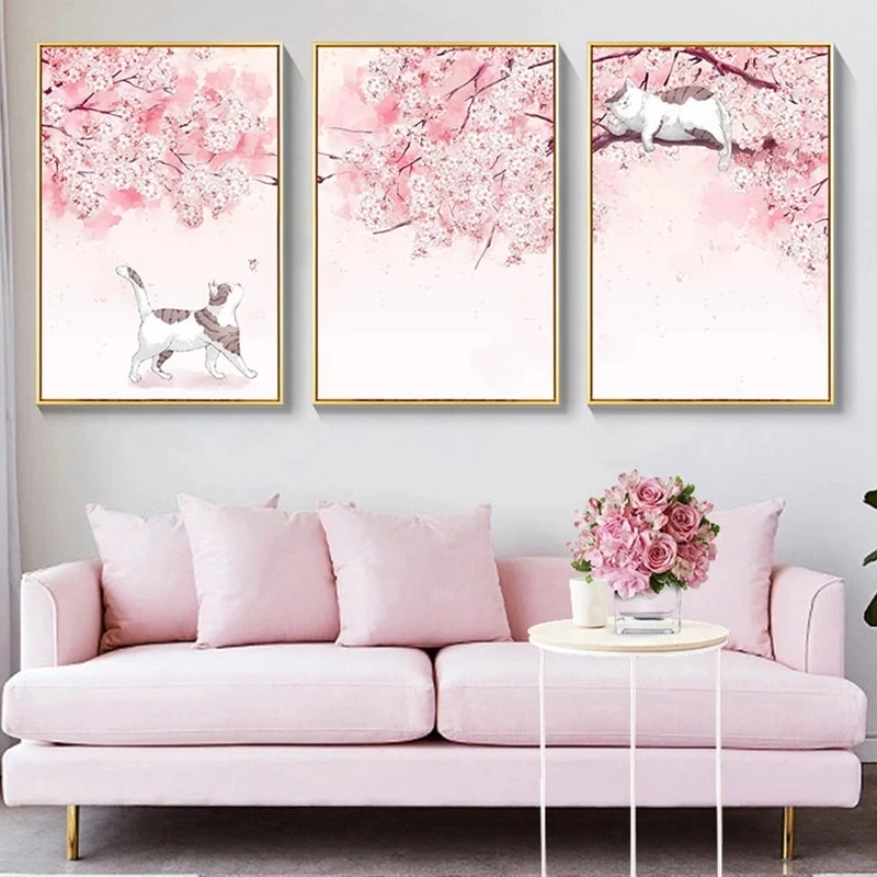 Постер с изображением цветущего вишневого пейзажа, милая кошка, Картина на холсте, мультяшная японская интерьерная живопись для дома, настенное искусство, декоративная картина