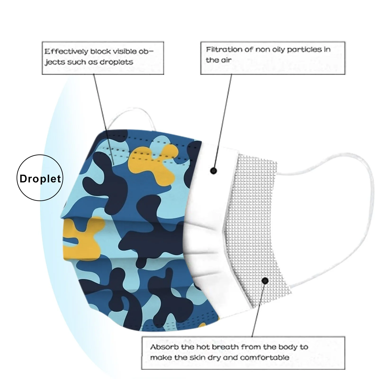 3 слояОдноразовая маска изготовлена из 3 слоев гидросплетенная ткань для тканевого материала,Он безопасен и безопасен для использования. Дышащий материал и милые узоры, что делает его полезным и модным. Специальный 3 слоя из нетканого материала, дизайн, обеспечивает некоторые меры защиты от пыли, автомобильный отходящий газ, пыльцу и т. Д. Эластичная петля уха позволяет легко снимать и надевать цепочку и не давит на уши. Маникюрный салон или любые другие области, где может потребоваться защита