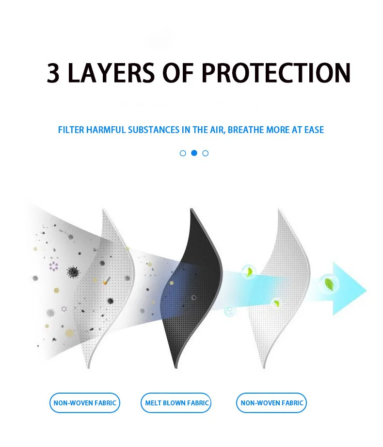 Безопасный и дышащий.Гипоаллергенный, высокая фильтрация, емкость.Чистый и полезный.Эластичные петли для ушей без давления на уши.Обеспечивают некоторую защиту от тумана, дымки и так далее.