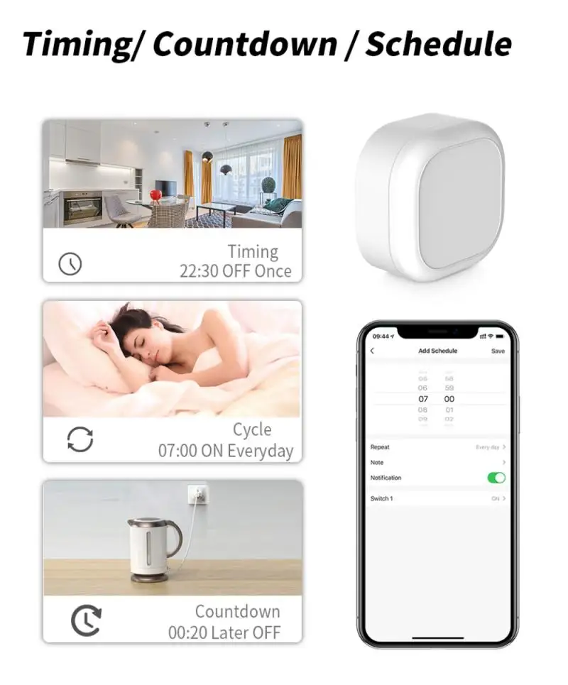 4. Время/Обратный отсчет/Расписание: вам очень хорошо настроить расписание для автоматического включения/выключения ваших устройств с помощью приложения. Вы можете установить обратный отсчет для увлажнителей, микроволновых песок, кофемашин и многого другого, устройство автоматически остановится. Не беспокойтесь, что устройство будет работать все время, помогая вам сократить счета за электричество.