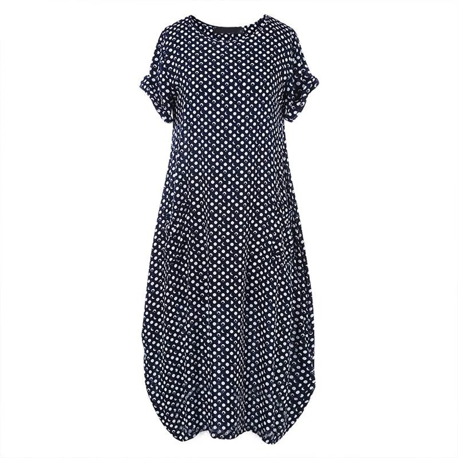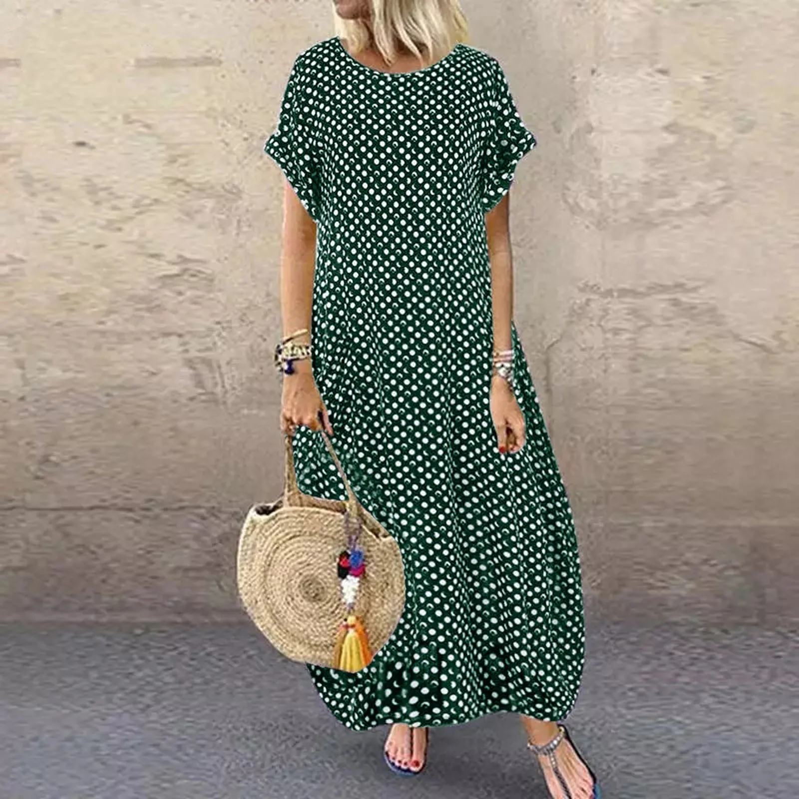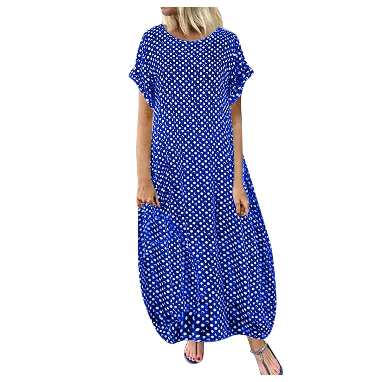 Летнее Повседневное платье макси для женщин, модное длинное платье в горошек с коротким рукавом и круглым вырезом, женские свободные пляжные платья