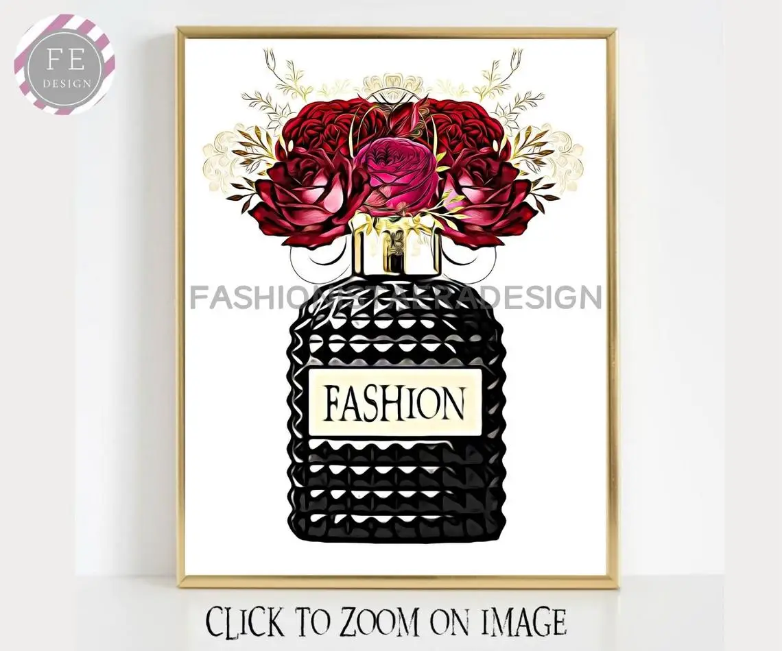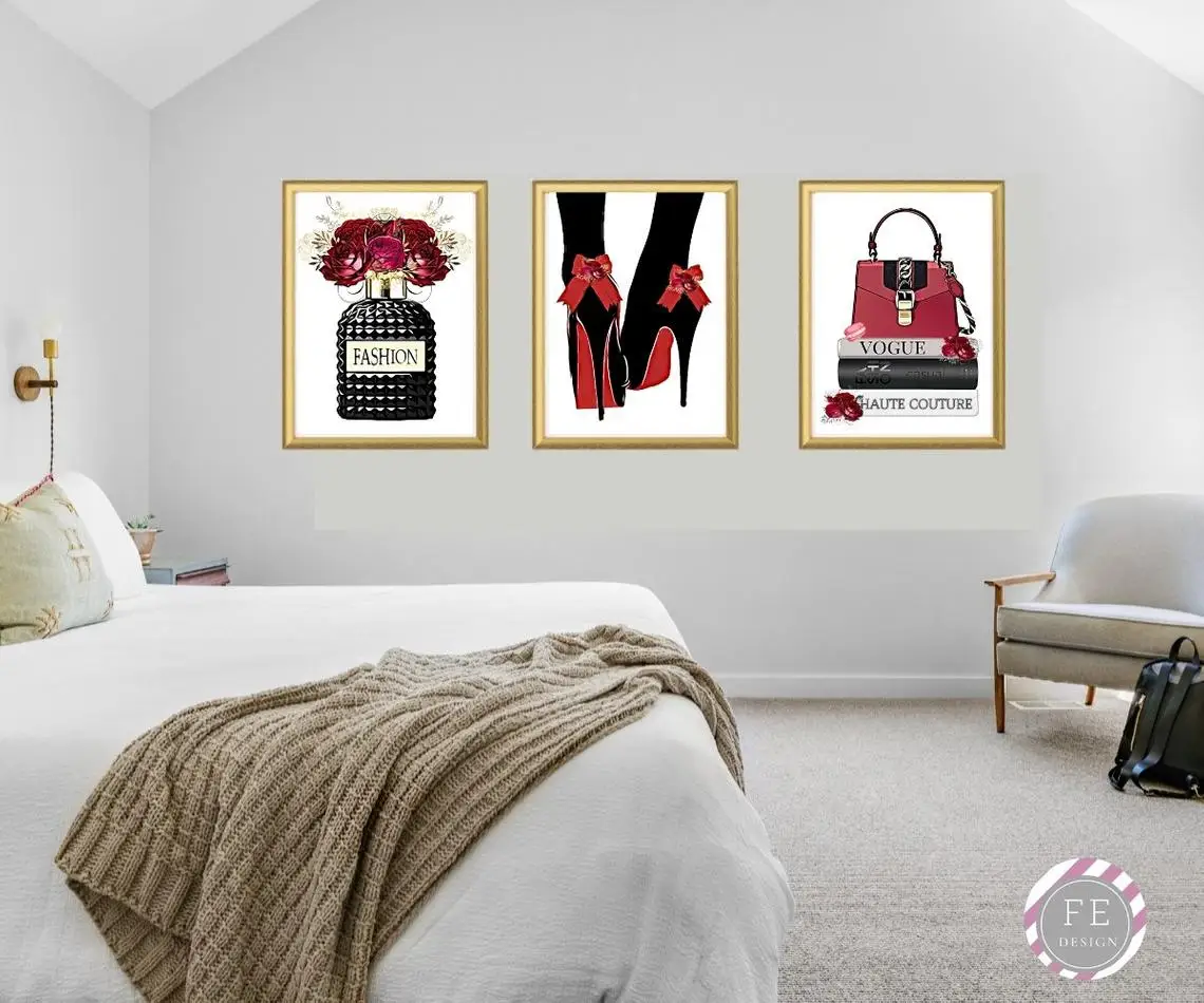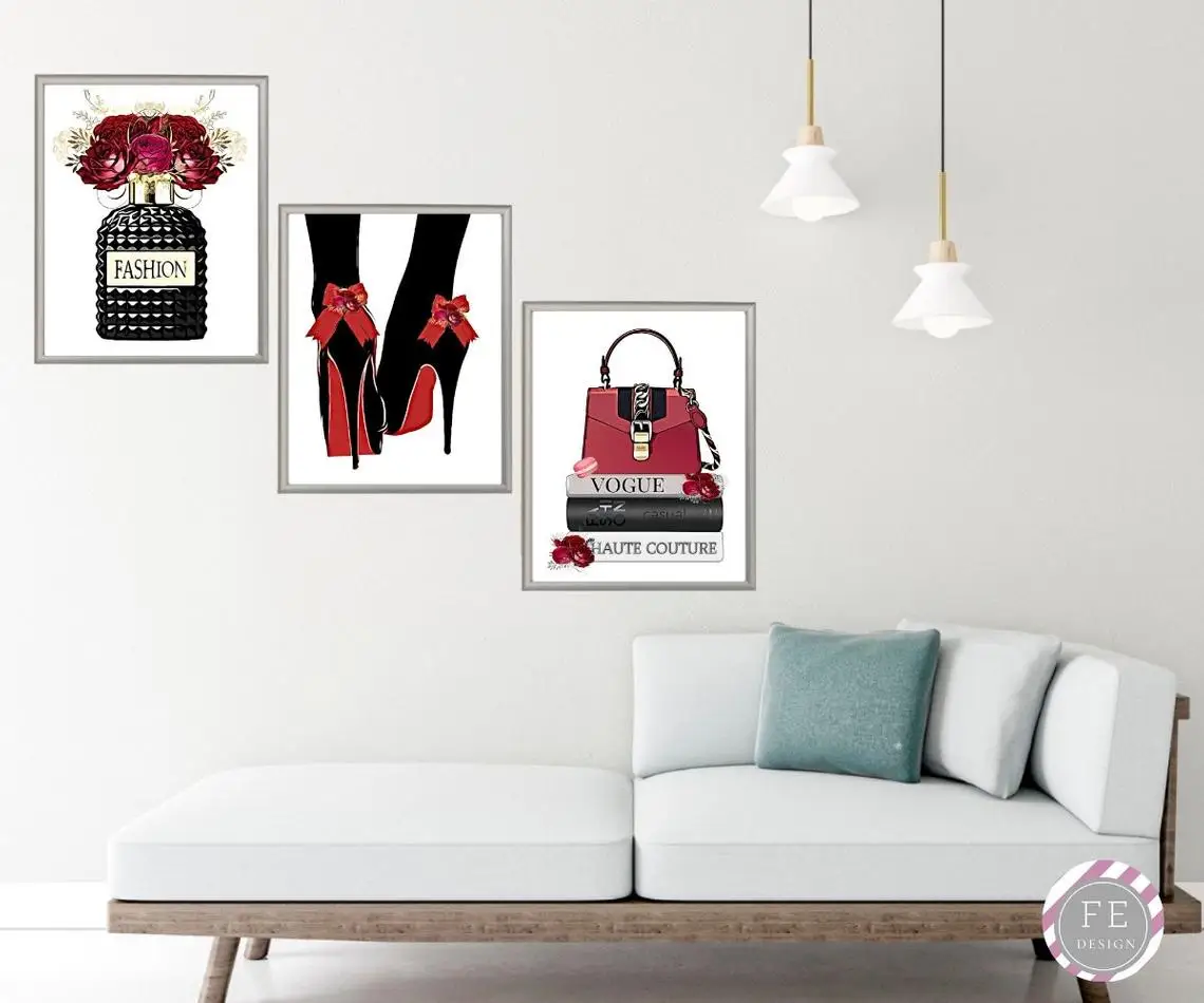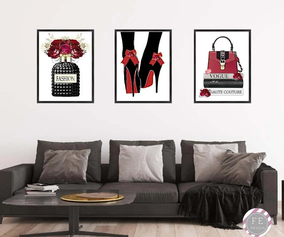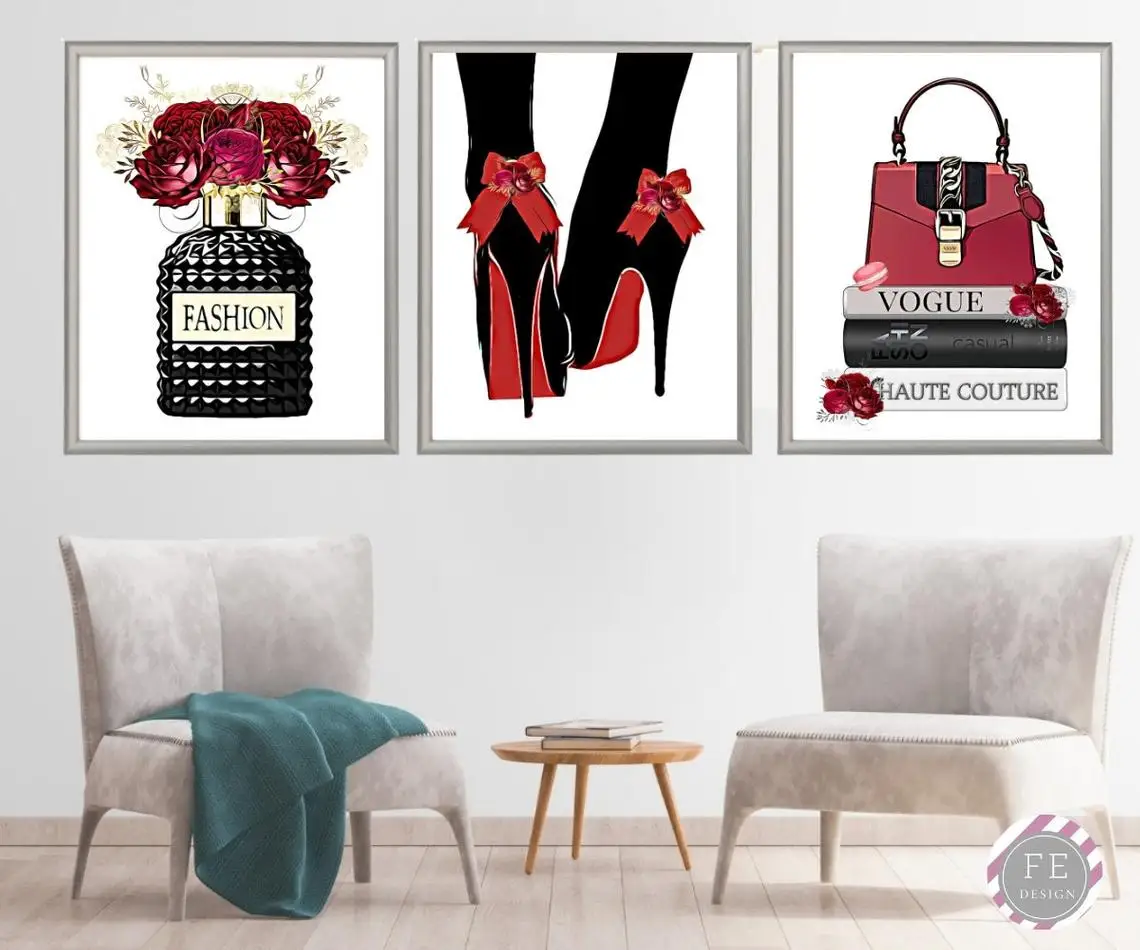 Модная Картина на холсте с флаконом духов, красная сумочка на высоком каблуке, Постер и печать, Настенная картина для гостиной, украшение для дома
