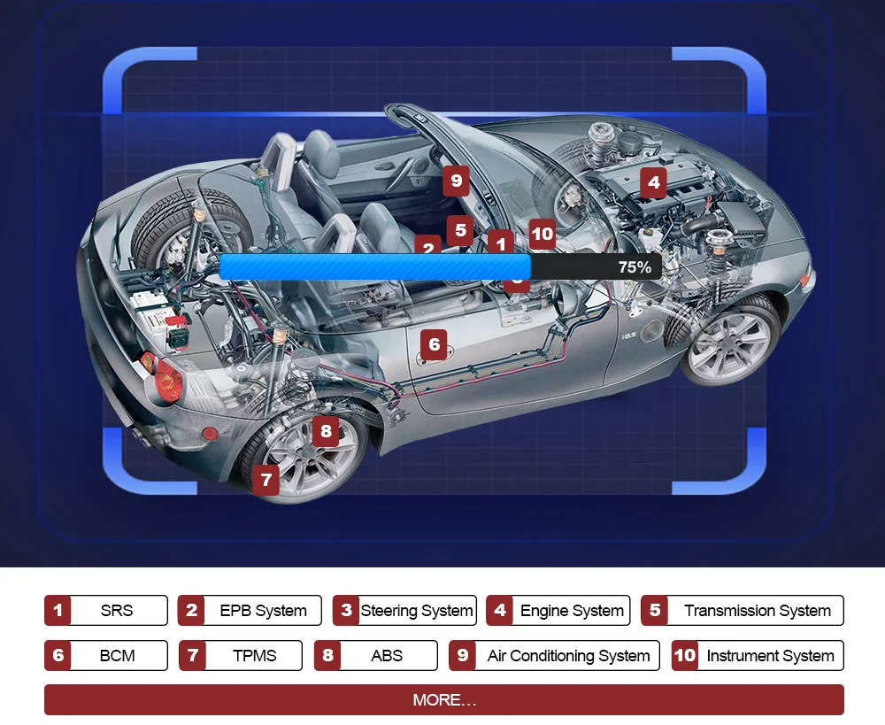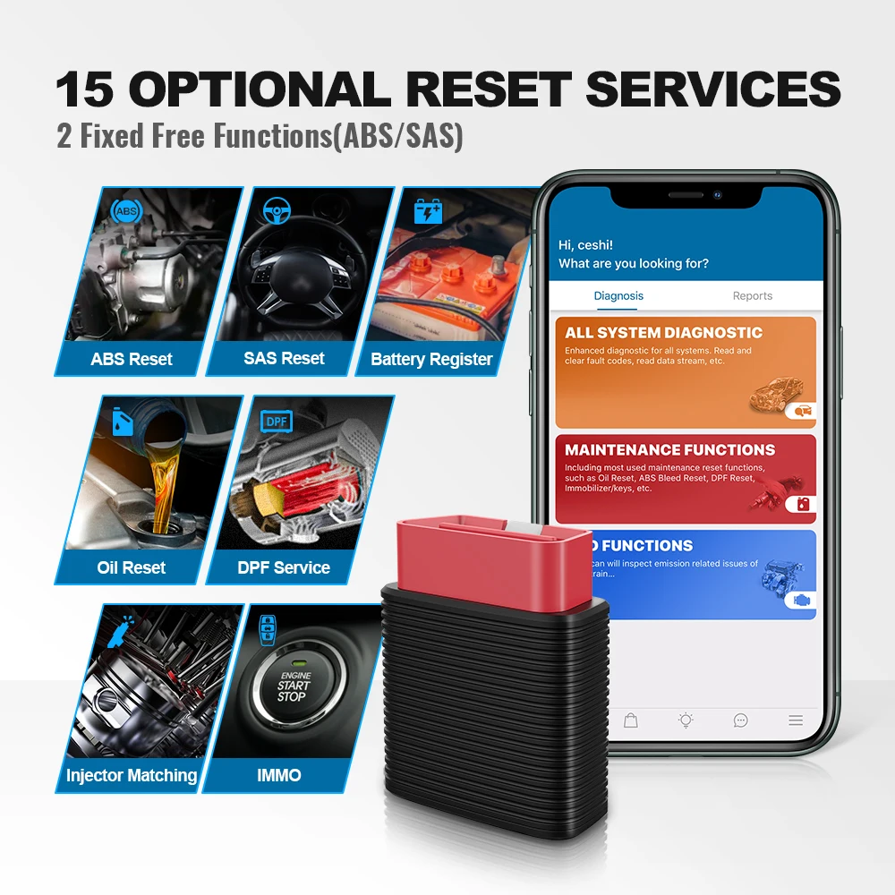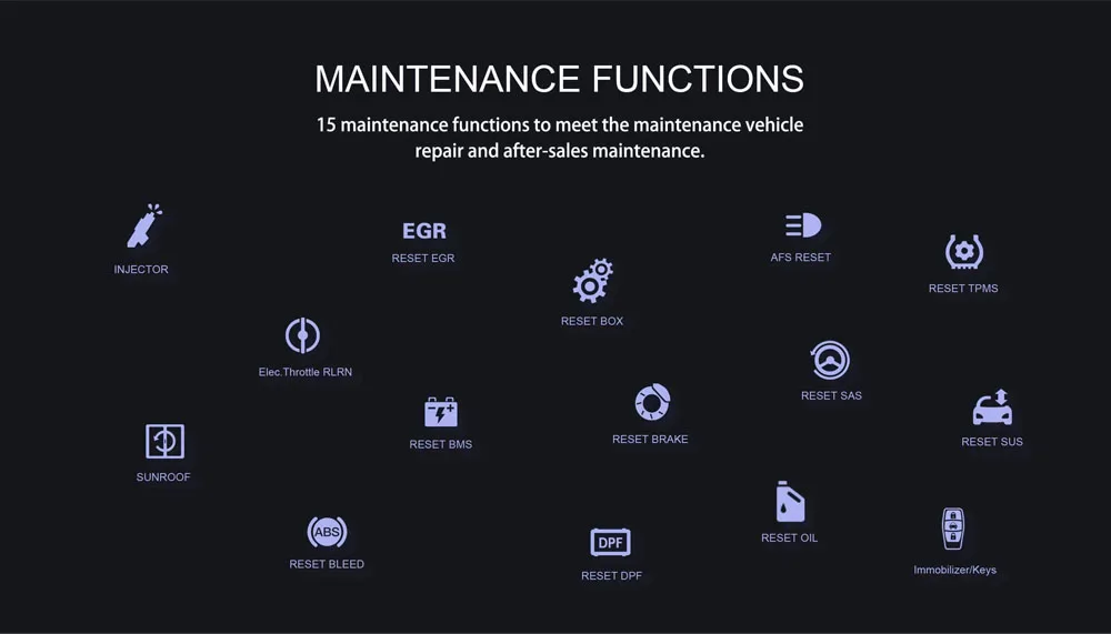 1. Обслуживание сброса масляной лампы: позволяет выполнить сброс для нового расчета системы жизнедеятельности моторного масла после изменения масла.2. Обслуживание EPB: важно в обслуживании безопасности и эффективности электронной тормозной системы.3. Батарея летучей мыши: позволяет сканировать инструмент для оценки состояния заряда батареи, контролировать ток замыкания, зарегистрировать замену батареи и активировать остальное состояние транспортного средства.4. Обслуживание DPF: специально работает для дизельной системы фильтров твердых частиц с регенерацией DPF, замена компонентов DPF после замены блока управления двигателем.5. Обслуживание SAS: помогает очистить воспоминания о датчике угла поворота и играет важную роль в калибровке датчика угла поворота руля.6. Обслуживание TPMS: имеет смысл в отображении сенсорных идентификаторов из ECU транспортного средства, ввод TPMS сенсорных сменных идентификаторов и датчиков тестирования.7. Программирование ключей IMMO: уникальное Программирование автомобильных ключей и функция считывания ПИН-кода, оно в основном используется для отключения потерянных ключей транспортного средства и программирования нового сменного ключа fob.8.ABS кровотечение: ABS тормозное кровотечение, чтобы получить твердую тормозную колодку После истощения воздуха после ремонта ABS насосной системы9. Сброс солнечного крыши: память солнечного крыши, как правило, необходимо сбросить, когда батарея транспортного средства заменена или машина умирает10. Сброс подвески: попробуйте сброс электронной Подвески с системой массажа закройте все двери koeo flip через систему measage перейти к сбросу подвески или выключению11. Сброс коробки передач: процесс сброса передачи Адаптивное обучение DIY. Запуск автомобиля и вождение. Как только вы выполните эту процедуру, блок управления двигателем (ECU) и блок управления передачей (TCU) будут работать вместе, чтобы узнать, как Вы управляете, отслеживая ваш шаблон вождения. После того, как вы выполните этот метод программирования TCU / ECU привод автомобиля.12. Сброс фар AFS: «AFS» означает адаптивную переднюю систему освещения (ночью с би-ксеноновыми фарами), она поворачивается с обеих сторон, нажатие этой кнопки означает, что они не поворачиваются вперед и не поворачиваются, когда вы поворачиваете руль13. Кодирование инжектора: утечки инжекторов и некоторые мертвые инжекторы могут быть пропущены даже когда инжектор отключен. Другие проблемы с системой зажигания и механическими компонентами также могут не показывать потерю оборотов в минуту при выключении инжектора14. Приспособление дроссельной заслонки корпус дроссельной заслонки представляет собой трубу, содержащую поворотный плоский клапан (бабочка), который используется для контроля количества воздуха, входящего в двигатель. В автомобиле с электронным топливом Датчик положения дроссельной заслонки и датчик воздушного потока связываются с компьютером, который поставляет соответствующее количество топлива, необходимое для инжекторов. Необходимо повторно изучить положение датчика дроссельной заслонки после очистки или ремонта15. Передача обучения: инструмент сканирования контролирует определенные датчики положения распределительного вала, чтобы определить, выполнены ли все условия, чтобы продолжить процедуру работы двигателя