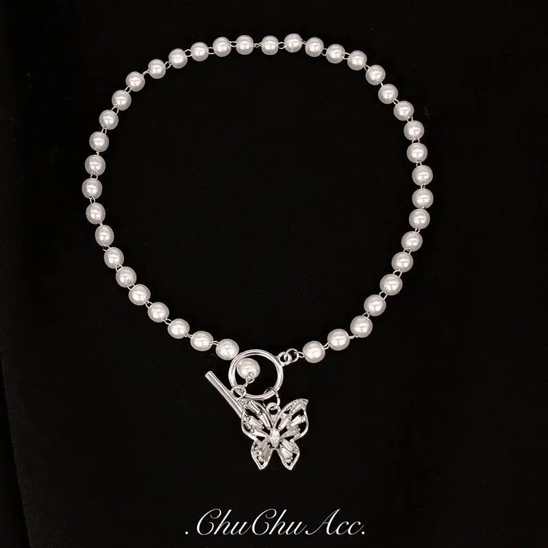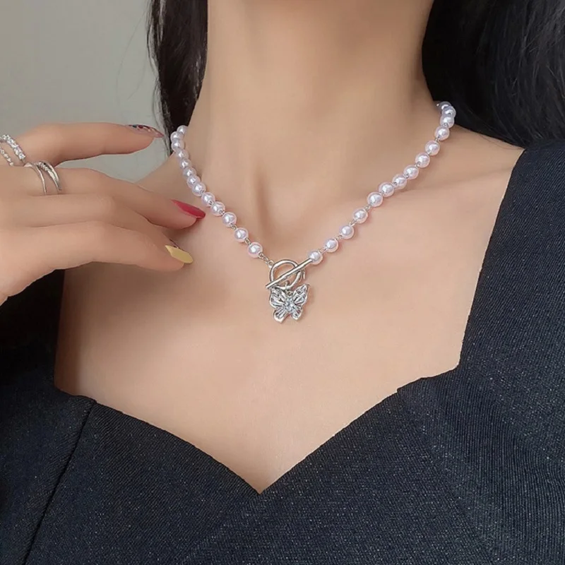Женское винтажное ожерелье-чокер с имитацией жемчуга и подвеской-бабочкой