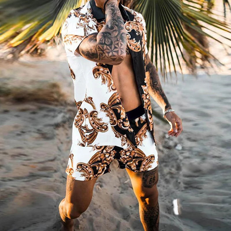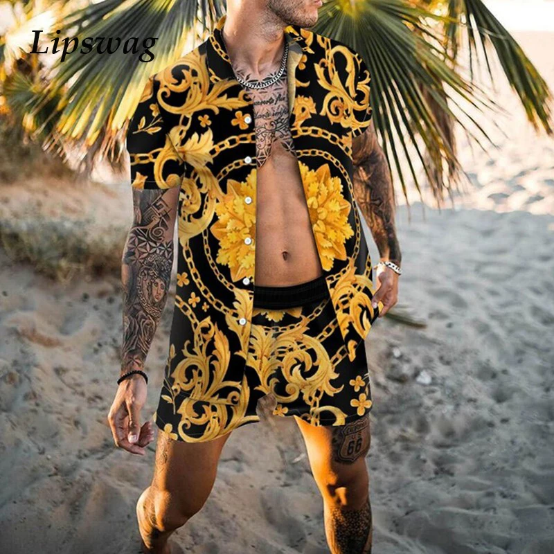 Костюм мужской повседневный пляжный из двух предметов, винтажный костюм с цветочным принтом, модная рубашка с воротником на пуговицах и шорты, костюм, лето 2021