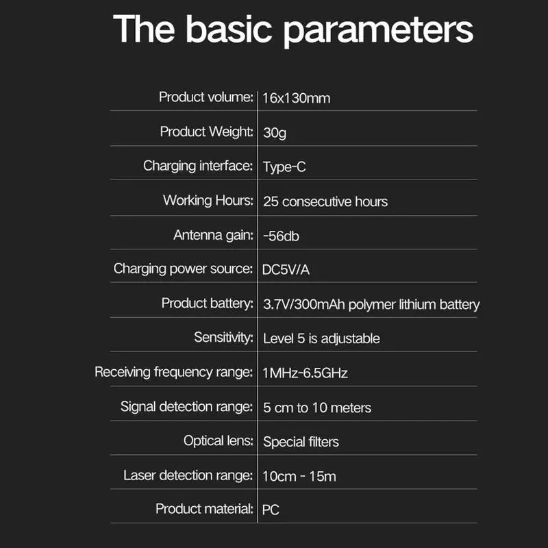 Описание товараОписание1. T8 detector использует передовые немецкие технологии, направленные на различные виды машинок, трекеров автомобилей, мобильный телефон под прикрытием программного обеспечения, беспроводные камеры pinhole, устройства для казино и других продуктов, а также разработанные напрямую средства безопасности и защиты. В то же время, Электрический измеритель радиации может защитить вас и вашу семью от повреждения электромагнитного излучения.2. Этот продукт лидирует в применении цифрового режима приема, который отличается от всех продуктов на рынке. Он не только расширяет частоту управления и измерения, но и эффективно предотвращает помехи сжимаемых сигналов во всем мире и значительно улучшает чувствительность.3. Также имеется динамическая Регулировка сверхбольшой чувствительности. Независимо от того, насколько сильный источник сигнала передает, он может быть легко расположен, регулируя ручку.4.T8 является самым передовым портативным беспроводным оборудованием для обнаружения сигналов, особенно для специальной обработки сигналов CDMA. Обычные радиоволновые детекторы не могут обнаруживать сигнал CDMA. Вы можете проверить чувствительность детектора, позвонив на телефонную карту телекоммуникации.5. Мобильный протокол CDMA-это Технология радиочастотной скачки, изобретенная США. Это светодиодный модуль cal с кодовым разделением, несколько входов (CDMA), и его мощность передачи очень низкая и не легко обнаруживается обычными беспроводными детекторами.6. Наиболее часто используемыми продуктами отслеживания и позиционирования на рынке являются карты CDMA; Поэтому T8-ваш лучший выбор. Особенности1. Профессиональное радио устройство обнаружения волн с высокой чувствительностью, регулируемым порогом и широким диапазоном обнаружения.2. Только выключатель питания + ручка чувствительности, простота в эксплуатации, простота в использовании, звуковой сигнал и светильник с сигнализацией, точный и надежный.3. Он может обнаруживать eavesdroppers и локаторы, оснащенные мобильными, unicom, телекоммуникациями, 2G.3G.4G картами.4. Локатор способен обнаруживать высокоскоростную загрузку пакетов данных GPS позиционера.5. 1,2G/2,4G Беспроводная камера может быть обнаружена.6. Не могли бы вы detectmore скрытый 5,8 ГГц беспроводная камера, беспроводной прослушивания. Применение1. Независимо от того, оснащен ли автомобиль или офис беспроводными машинами или локаторами слежения.2. Если мобильный телефон подслушивается или является ненормальным (режим ожидания должен отправлять сигналы без причины.3. Рабочая среда, есть ли радиация базовой станции на крыше жилого здания.4. Мобильный короткий прием и отправка сообщений, доступ в Интернет и мониторинг вызовов.5. Беспроводная сеть, мобильная базовая станция, мониторинг беспроводной системы мониторинга.6. Обнаружение утечки электромагнитного излучения в бытовых приборах, таких как микроволновые печи.7. Есть ли подозрительные беспроводные сигналы в окружающей среде.8. Проверьте ванные комнаты, гостиницы, развлекательные места, гардеробные, государственные органы,И т. д.9. Деловые переговоры, инспекция школ, мастерских, объектов.10. Радиоволны совпадают с движениями на столах Маджонга.11. Ипотекный автомобиль, Подержанный автомобиль, ломбард, гарантийная компания, микро-Кредитная компания, компания по информационным кр
