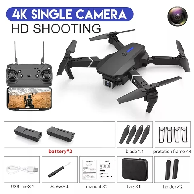 1 * E525PRO RC Квадрокоптер 1 * пульт дистанционного управления 1*3,7 V 1800mAh Lipo батарея 1 * USB кабель для зарядки 4 * защитный чехол 4 * Запасные ломтики 1 * мешок для сбора