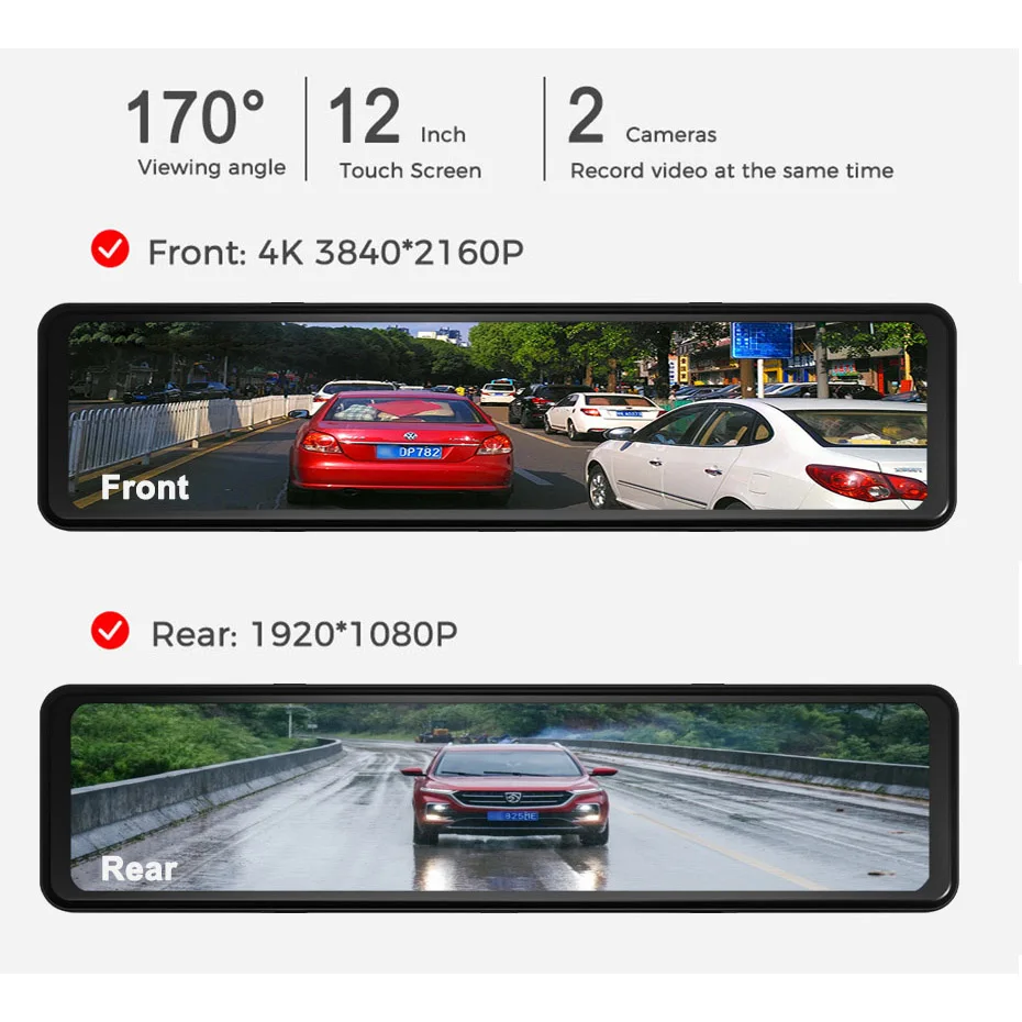 UHD 4K 2160P 12 дюймов Видеорегистраторы для автомобилей потоковый медиа-Touch Экран для авто Двойной объектив видео Регистраторы Зеркало заднего вида резервного копирования Камера Dash Cam