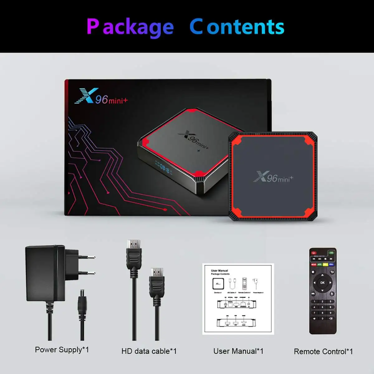 Посылка входит1 x ТВ-приставка1 х пульт дистанционного управления1 х кабель1 х адаптер питания1 x руководство на английском языке