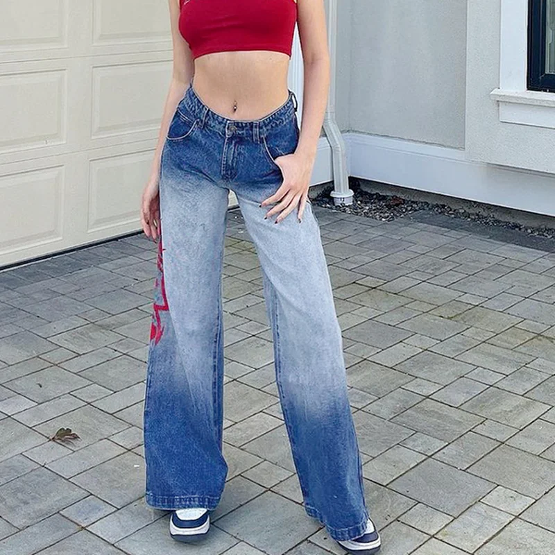 Джинсы женские с широкими штанинами, свободные джинсы из денима в стиле ретро, с принтом, в Корейском стиле, уличная мода 90-х, комбинезон с заниженной талией, лето 2021