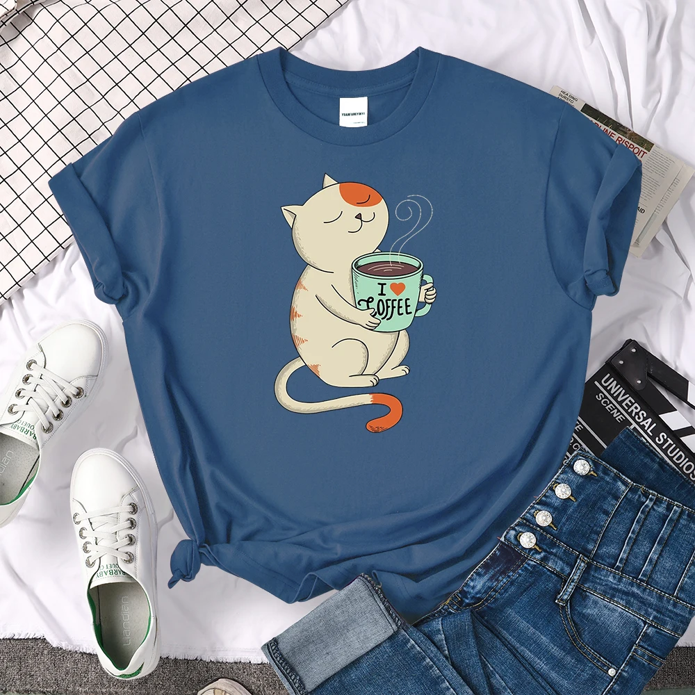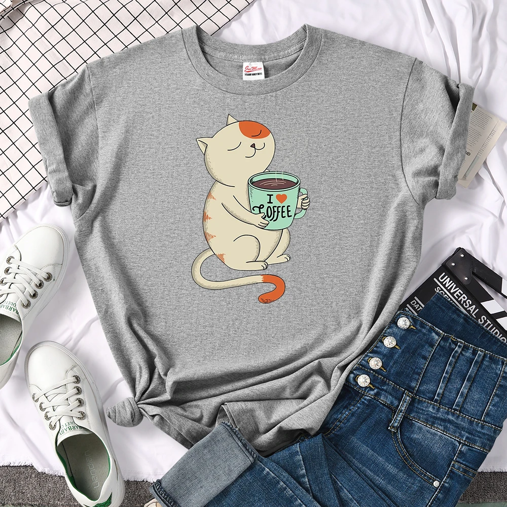 Женские футболки с принтом «I Love Coffee Orange Cat», облегающие футболки с мультипликационным принтом, Спортивные Повседневные женские футболки