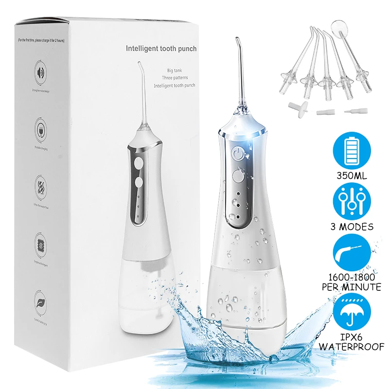 Особенности:1600-1800 раз/мин Скорость впрыска: сильная очистка трудно очистить частиВсенаправленная очистка: 80 ° конструкция сопла легче и экономична, улучшая при этом область очисткиСветильник, тонкий и портативный: вес нетто всего 266 гДлительный срок службы батареи: 2 минуты в использовании350 мл большой резервуар для воды: Съемный резервуар для водыКласс водонепроницаемости IPX6: полностью моющаяся Специальная водонепроницаемая обработка3 режима: одна кнопка переключения многократного ухода, режим очистки, импульсный режим, режим серфингаУдаляет мусор между зубами, которые трудно достичь с помощью нити. Уменьшает бактерии и освежает дыхание.Промойте зубы после еды и перед сном, сохраните здоровье для полости рта.Легко переносить в путешествие.Может достигать всех точек рта.