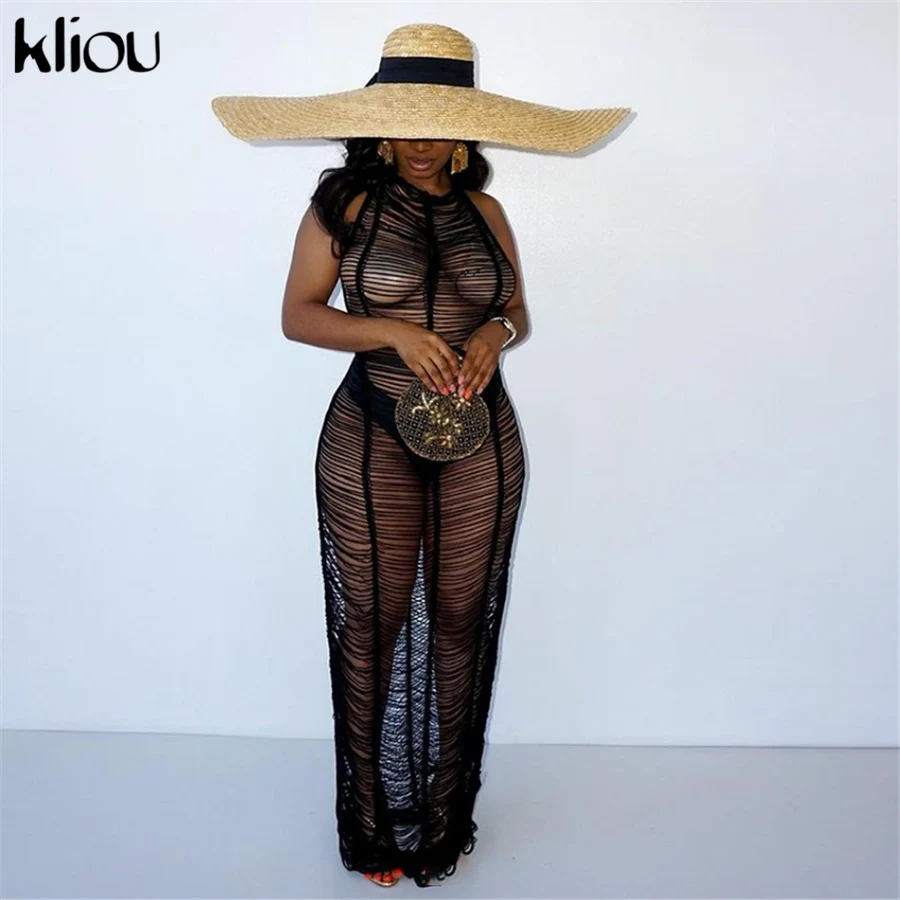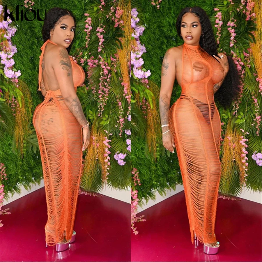 Женское Сетчатое платье-макси Kliou, прозрачное сексуальное Клубное платье без рукавов с открытой спиной на бретельках