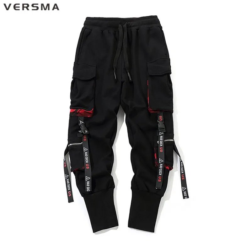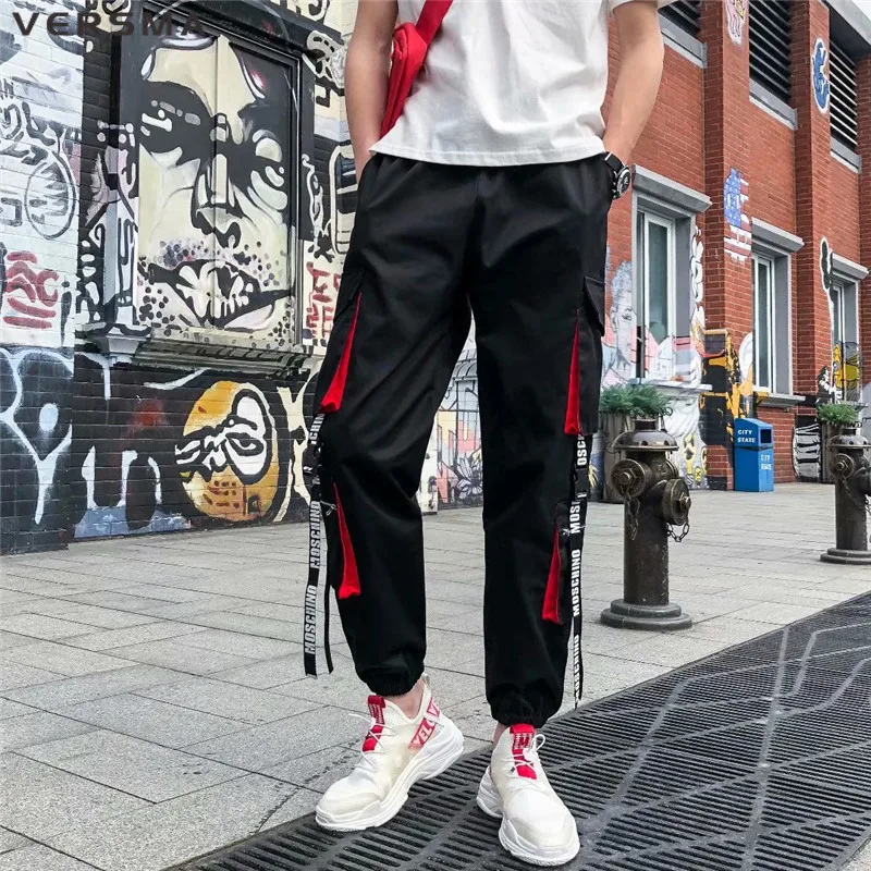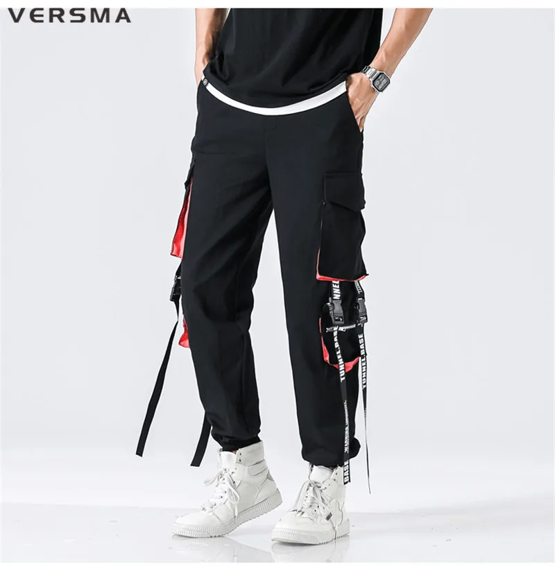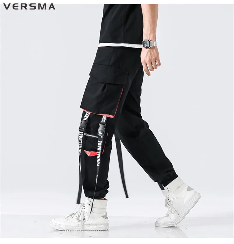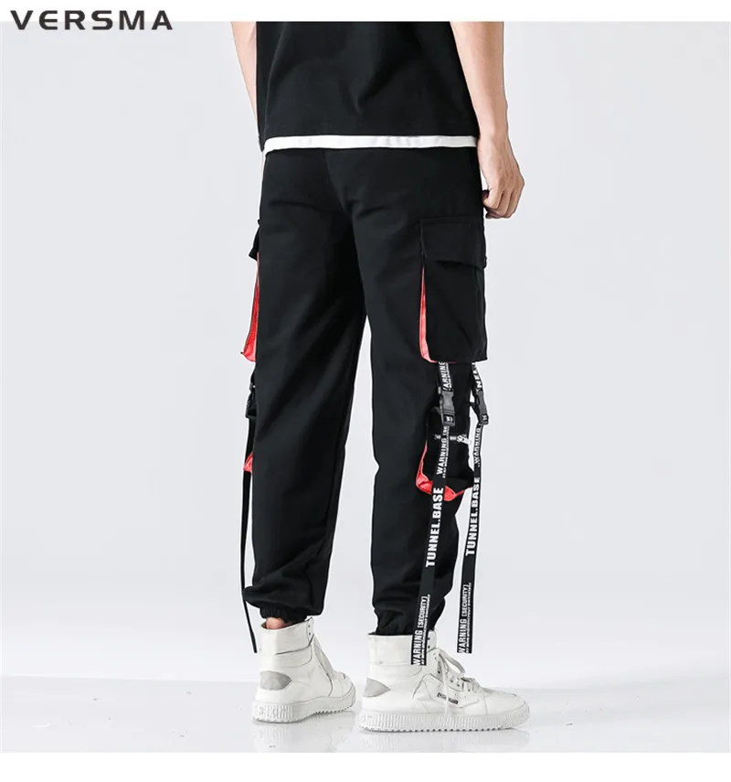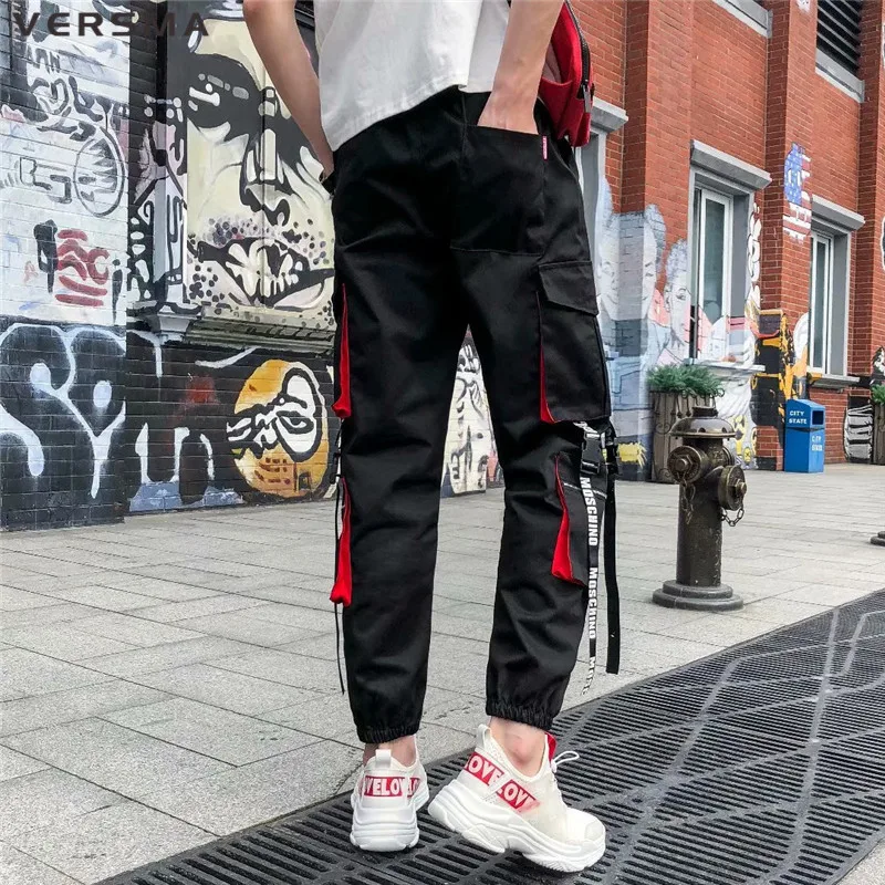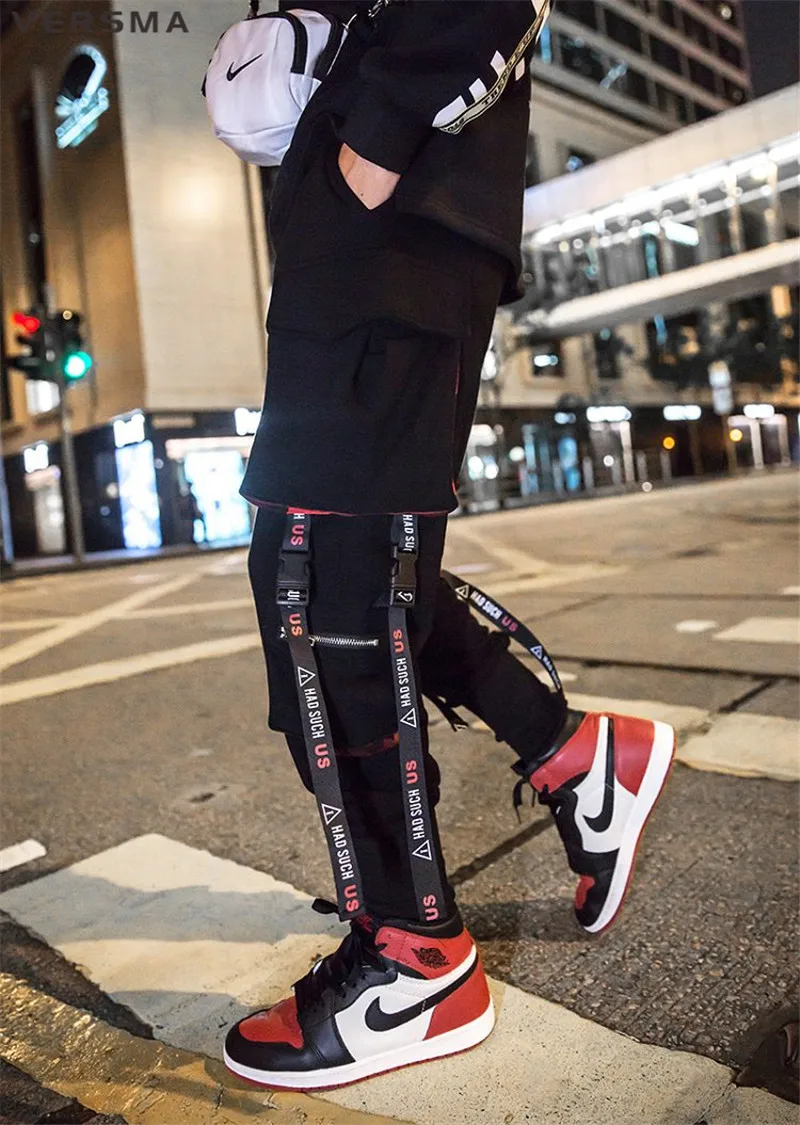 VERSMA Японская уличная одежда ленты дизайн брюки-карго штаны Для мужчин в стиле хип хоп панк Рок свободные BF малышовые штаны Для мужчин дропшиппинг