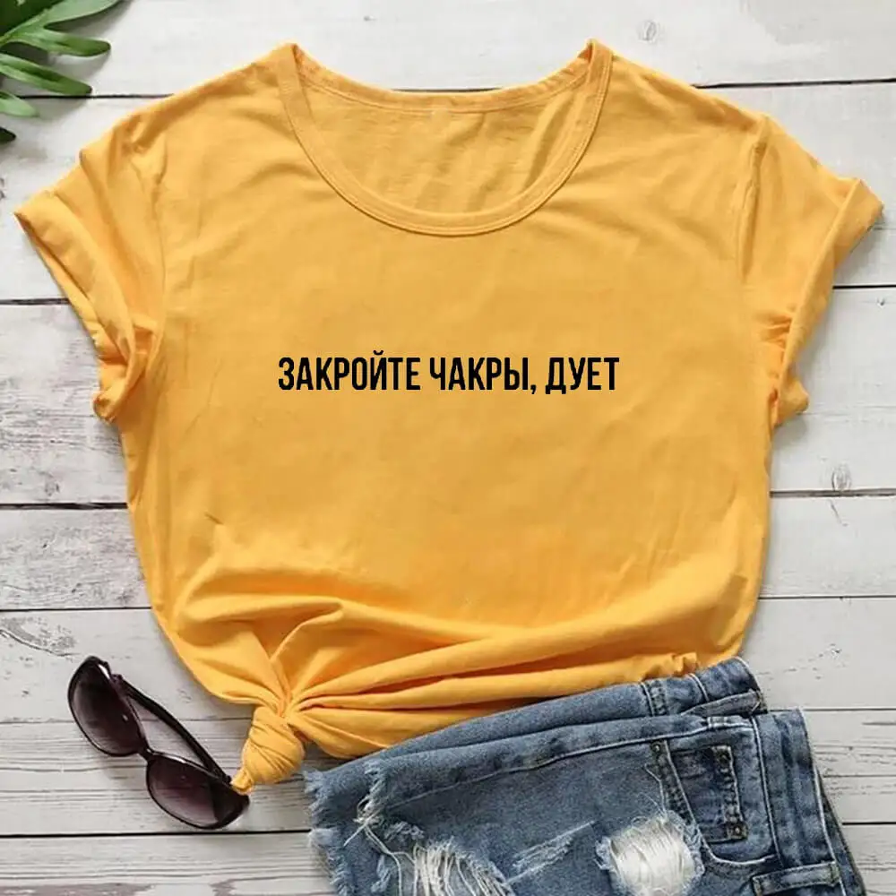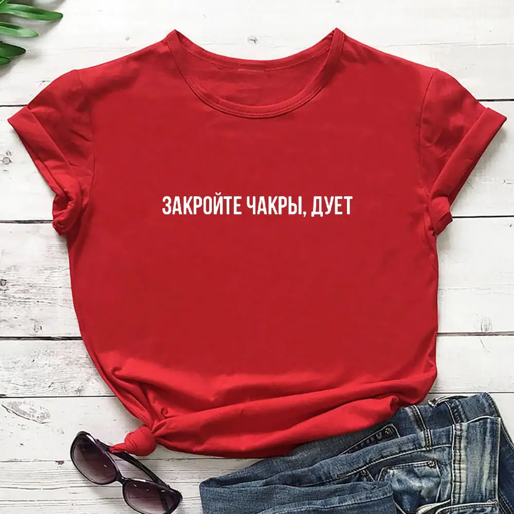 Закройте чакры Женская футболка из 100% хлопка с русской кириллицей...