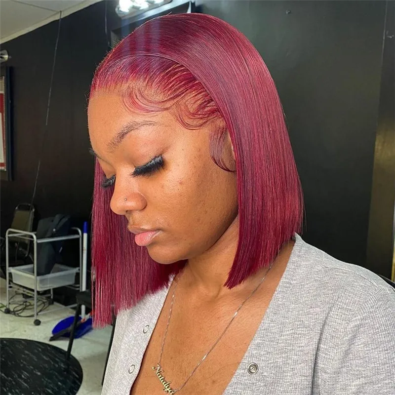 99J Бургундия короткий боб парик Прямые Цветные человеческие волосы парики для женщин темно-красный кружевной части парик предварительно сорванные волосы Remy