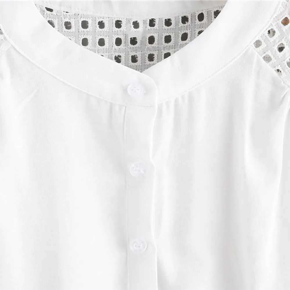 Женская ажурная блузка с круглым вырезом, однотонная Повседневная элегантная белая рубашка на пуговицах, с коротким рукавом-бабочкой, на лето