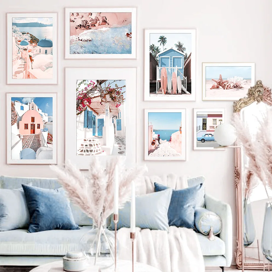 Настенные картины с изображением розовых цветов, пляжа, дома, двери...