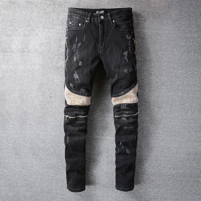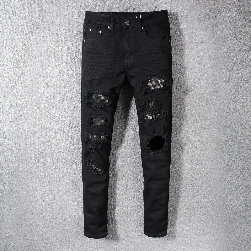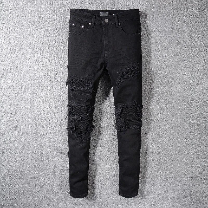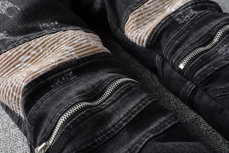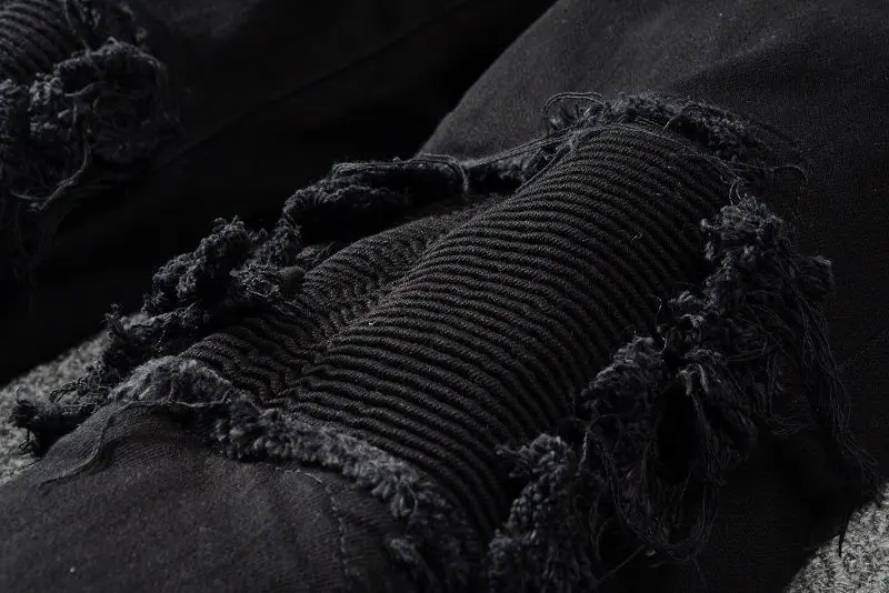Джинсы мужские рваные в складку, модные брендовые брюки в байкерском стиле, рваные джинсы в стиле Хай-стрит, Стрейчевые брюки в стиле пэчворк, черные