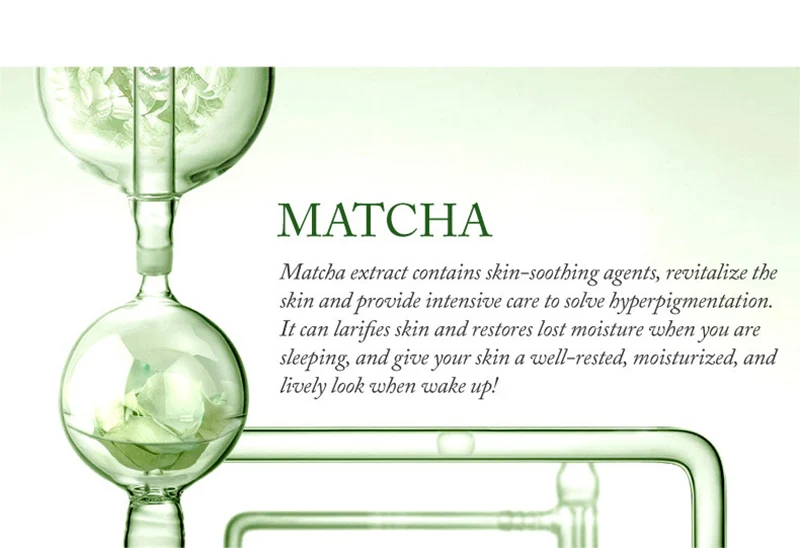 Экстракт матча содержит успокаивающие средства для кожи, которые могут оживить кожу и обеспечить Интенсивный уход для улучшения гиперпигментации кожи. Он может осветить кожу и восстановить потерю влаги во время сна, а также придать коже приятный, увлажненный и живой вид при пробуждении!