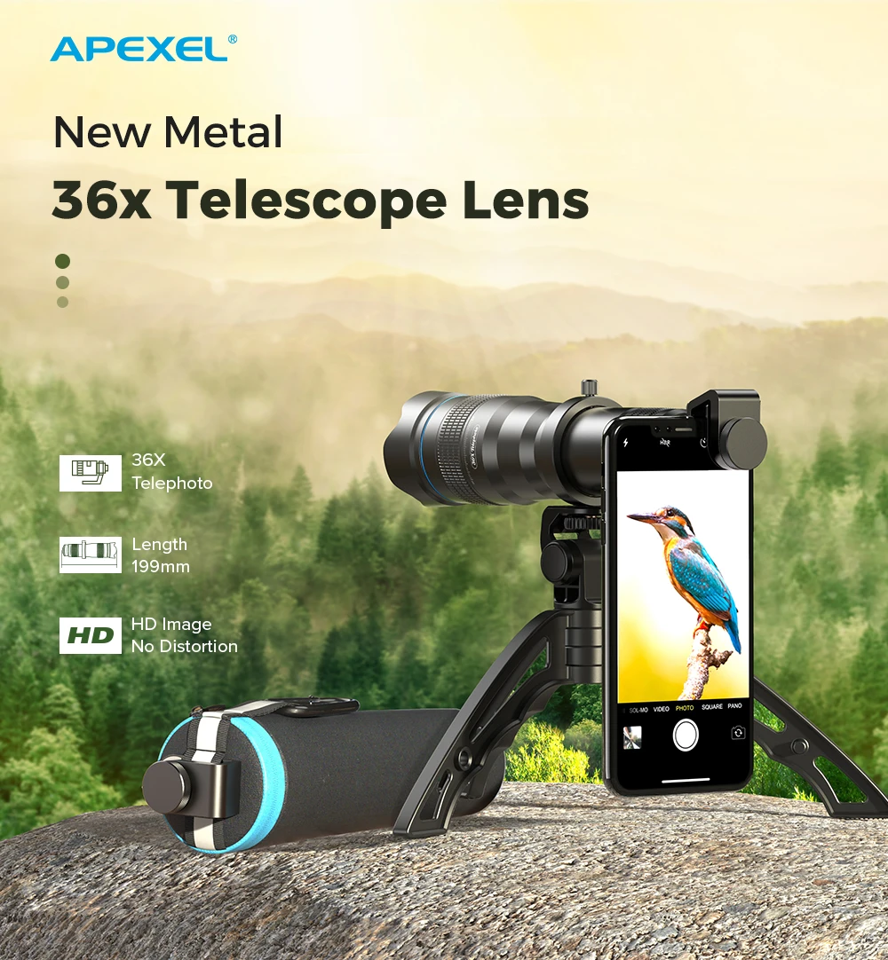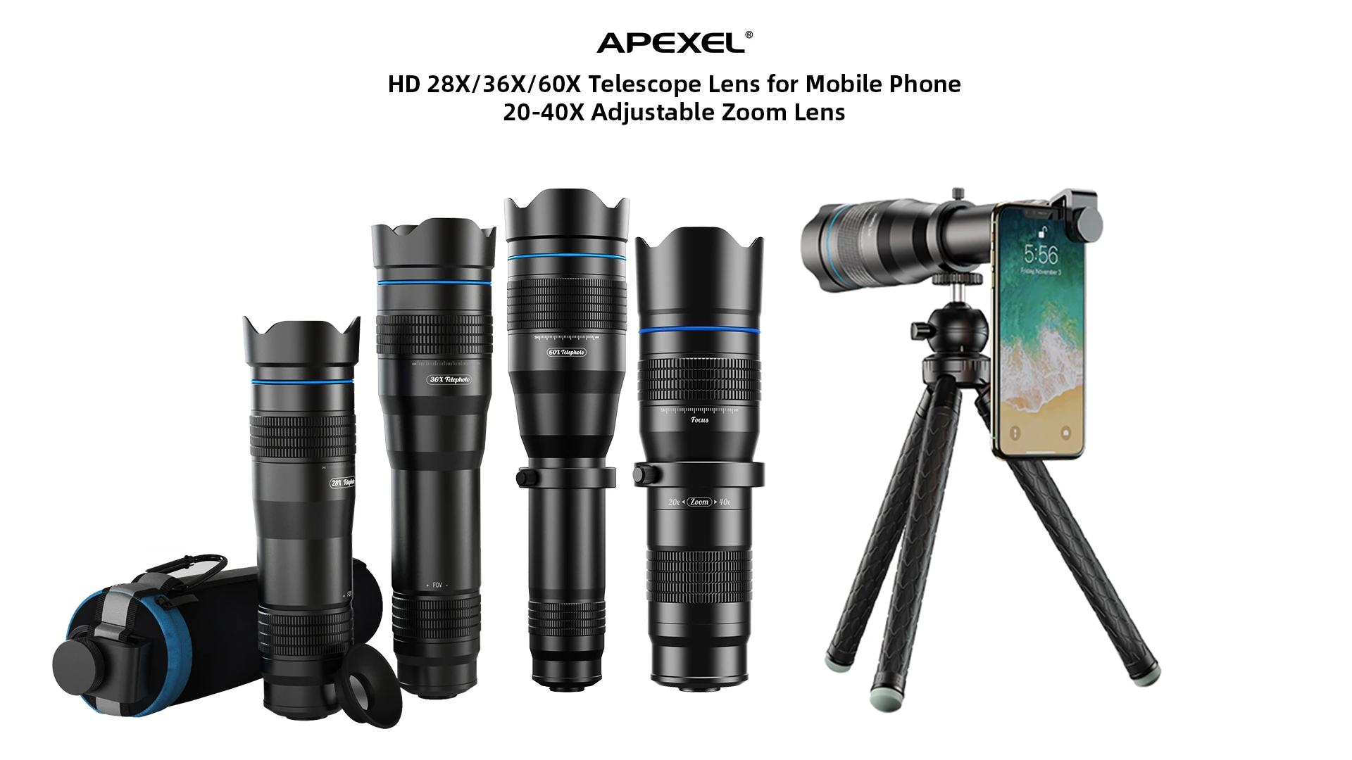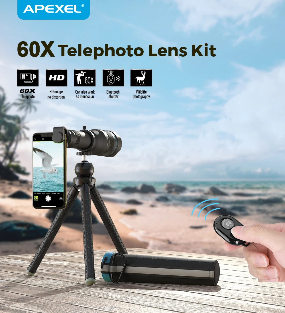 Профессиональный зум-объектив APEXEL HD 20-40X28X36X60x с селфи-штативом и затвором наблюдайте за луной для iPhone 13 HUAWEI