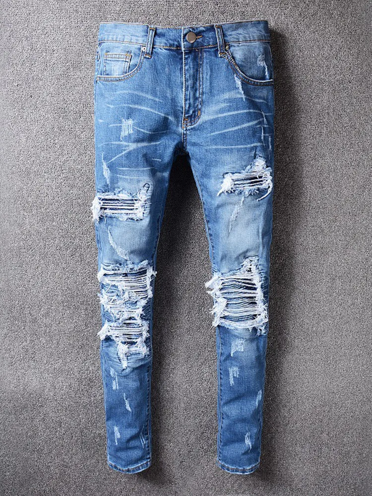 Винтаж лоскутное отверстия синие джинсы Для мужчин Slim Fit дизайне...