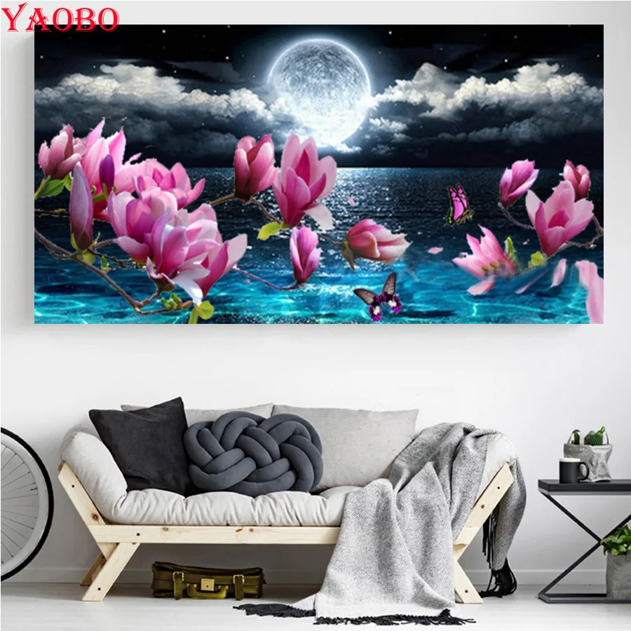 5d яркая луна в синем море Алмазная картина полная круглая Магнолия вышивки диаманта цветы 5d diy Алмазная мозаика большого размера