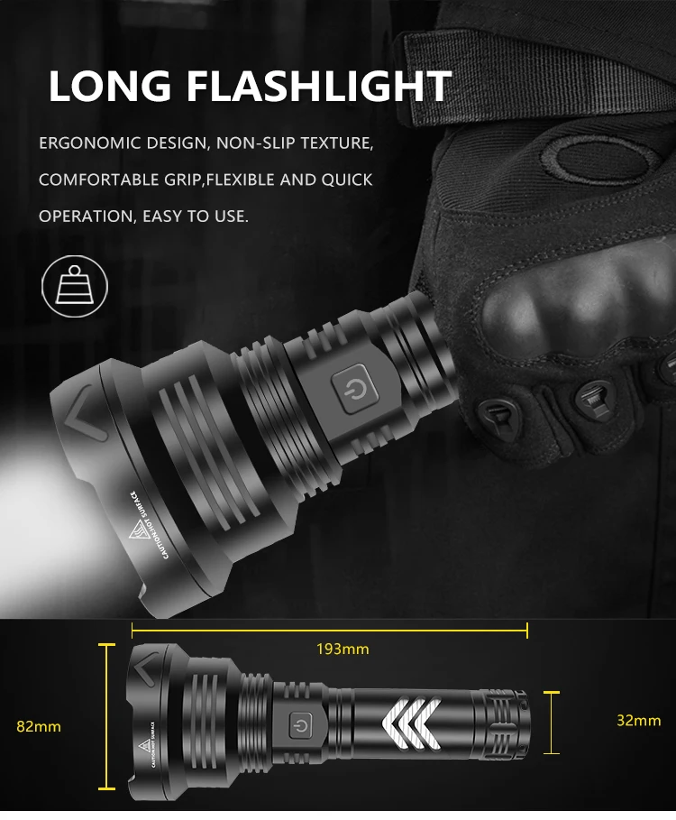 ● Лампы: XHP160.2● Размер: 19,3*8,2*3,2 см● Материал: авиационный алюминиевый сплав● Зарядное устройство: зарядное устройство Type-C● Источник питания: перезаряжаемый аккумулятор 18650 или 26650● Срок службы фонаря: 100000 часов● Время освещения: 18650 (2-6 часов) 26650 (4-10 часов)● Степень водонепроницаемости: IPX-6