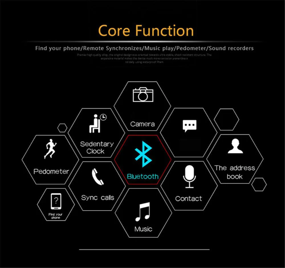 Функции: звонящий по Bluetooth, контакты, напоминание о звонках, часы, защита от потери, шагомер, монитор сна, напоминание о сидячем положении, календарь