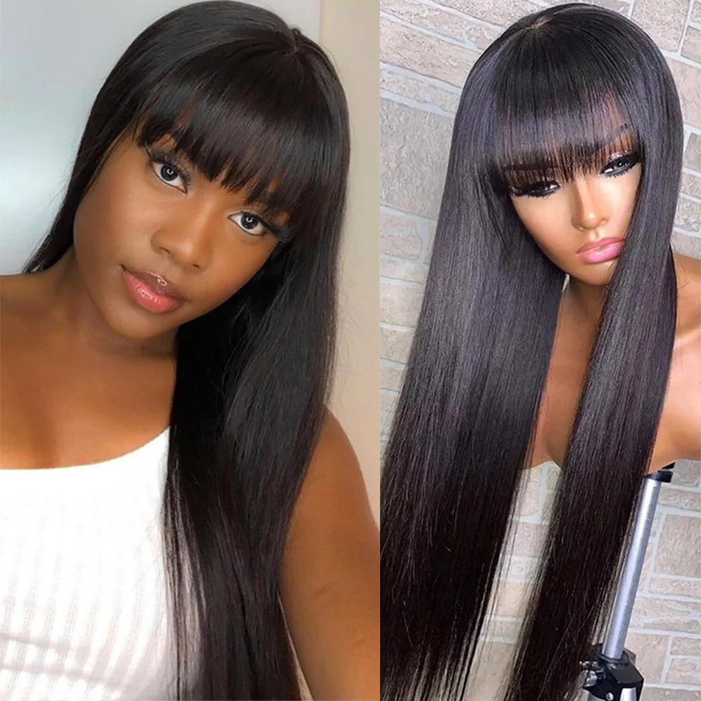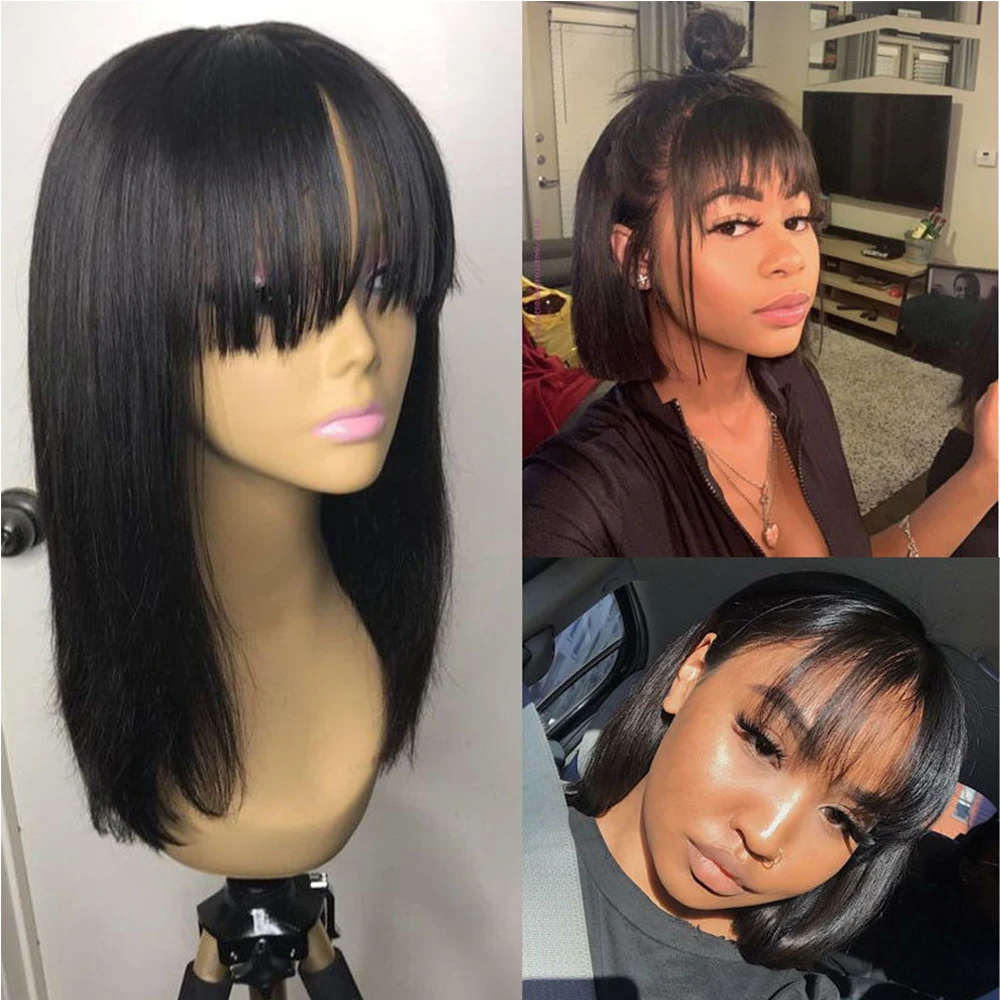 Парики из прямых человеческих волос с челкой, Remy, полностью машинное изготовление, дешевый длинный парик из человеческих волос для женщин, парик с безклеевой бахромой, Боб