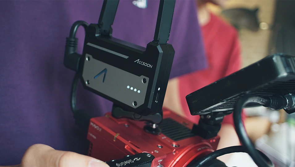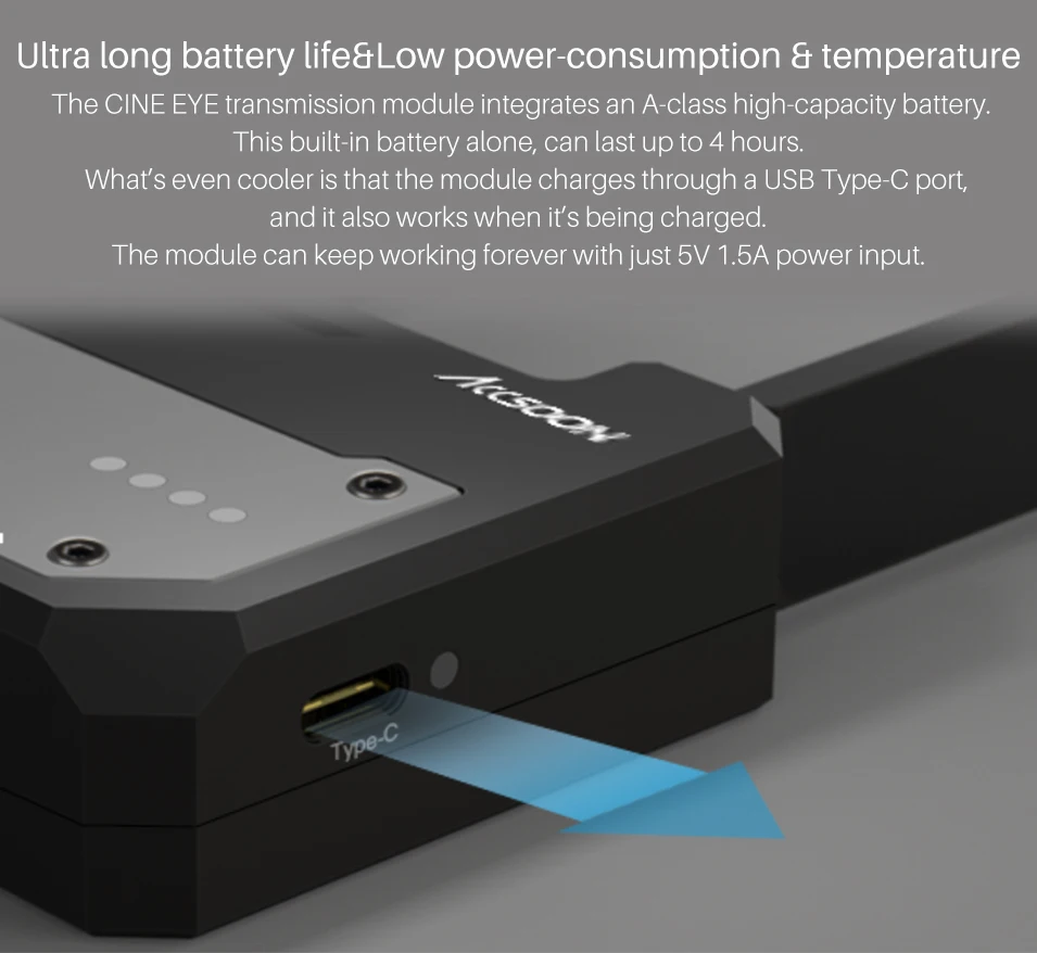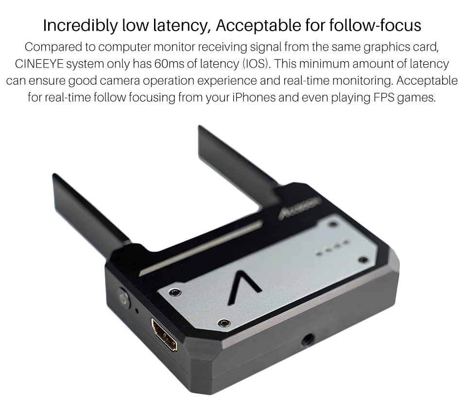 Система CINE EYE использует 5G частоту для передачи сигнала, что позволяет более высокую пропускную способность при даже более высоких скоростях, что компания утверждает, что CINE EYE имеет сверхнизкую задержку и хорошее качество прямого потока.AccsoonГоворит, что сигнал 5G более устойчив к помехам. Корпус CineEye сделан из алюминия, он приятный и компактный. Модуль передачи глаза CINE составляет всего 90 мм x 63 мм x 21 мм со сложенными антеннами.