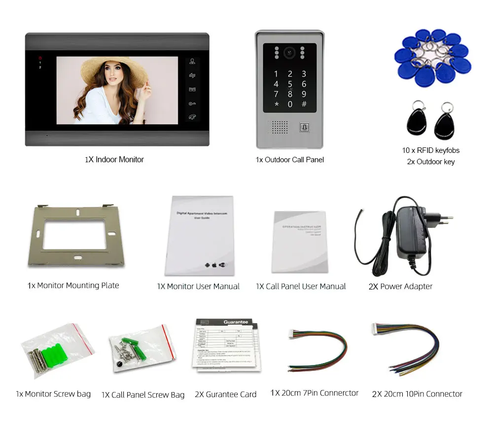 1 внутренний монитор1 наружный дверной Звонок1 Монтажная пластина для монитора1x панель вызова Руководство пользователя12х pфид карта2x гарантийная карта5x 4-контактный разъем1x 2pin разъем2x источник питания