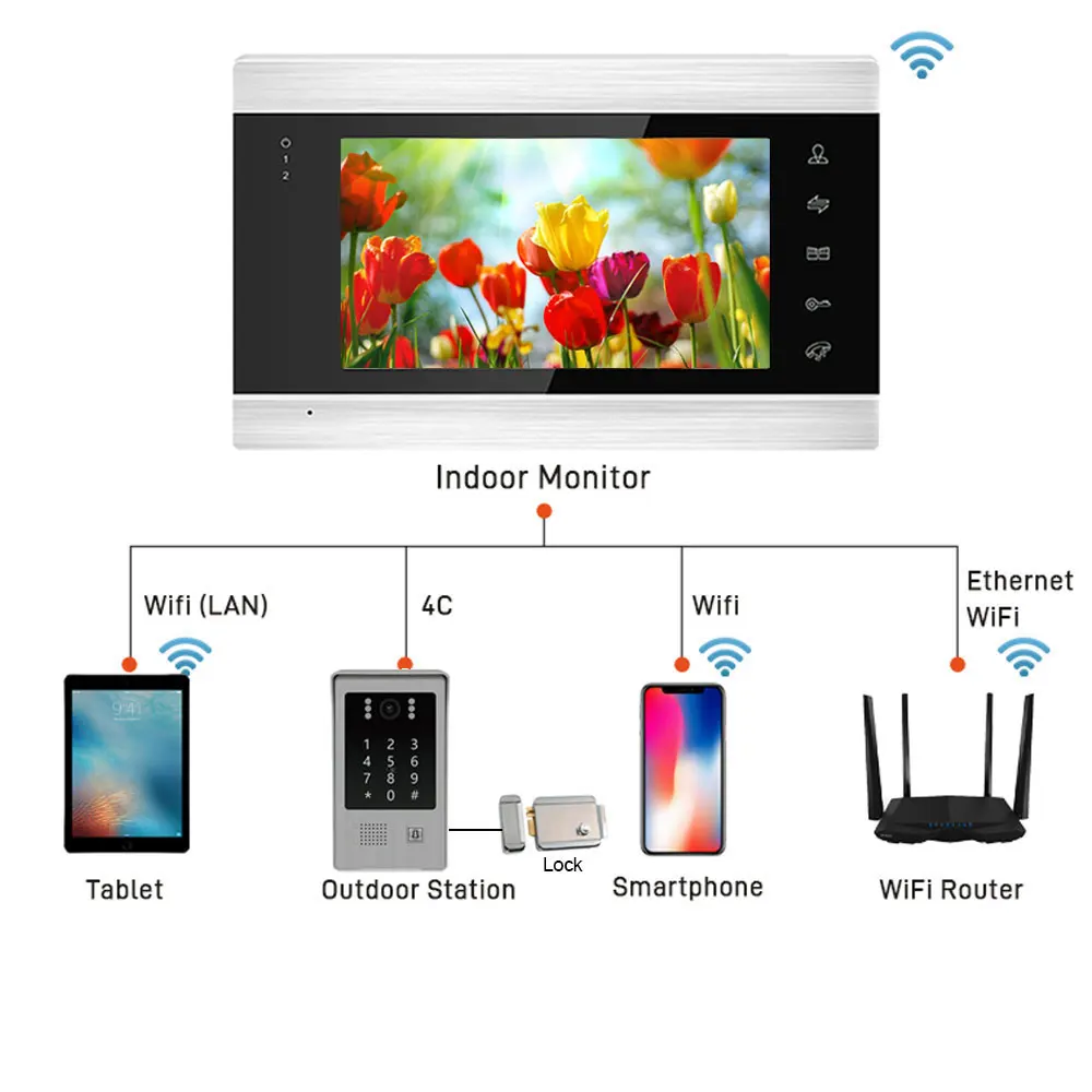 Обратите внимание, что система видеодомофона Wi-Fi не означает, что вам не нужен провод. Монитор поддерживает беспроводное подключение к Wi-Fi или RJ45 для подключения к WIFI, но внутренний монитор и дверной звонок проводной, что гарантирует питание, видео работает стабильно, и вы можете увеличить расстояние