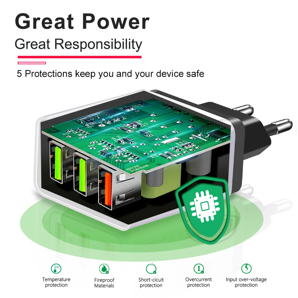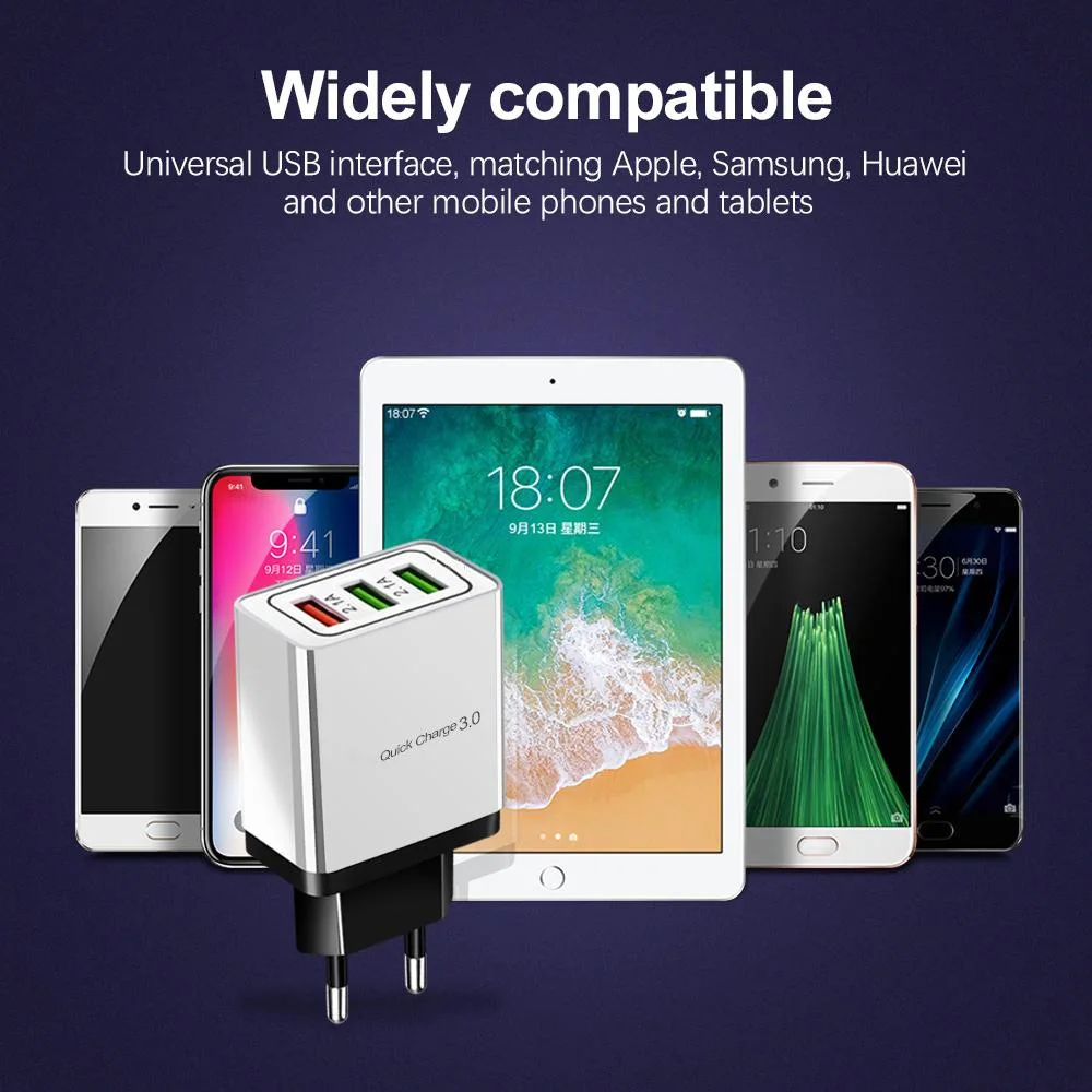 Зарядное устройство с 3 USB-портами QC 3,0, быстрая зарядка, адаптер с вилкой европейского стандарта для iPhone 12, Huawei, Xiaomi, быстрая зарядка, USB-зарядное устройство с несколькими портами