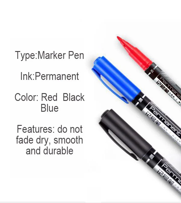 -Тип: маркер-Тип чернил: перманентные-Цвет: красный/черный/синий-Особенности: не выцветает/гладкий и прочный-Прозрачный цвет-Один Размер 0,5 мм, другой размер 1,0 мм-Водонепроницаемый не выцветает-Длина ручки: как показано на рисунке-Водостойкие быстросохнущие масляные чернила.-Наш магазин предлагает вам лучшее качество!-Не выцветает, износостойкий. Можно писать на любой гладкой поверхности-Без излучения, накройте ручку после использования-Особенности продукта:Чернила быстро сохнут, устойчивы к размазыванию и выцветанию и водостойки.Кончик фетрового долота хорошо заметен, линии на гофре, дереве, металле, фольге, камне, пластике и коже. Также работает на влажных или жирных поверхностях.100% новый и высококачественныйДвойные насадкиОдин размер 0,5 мм, другой размер 1,0 мм