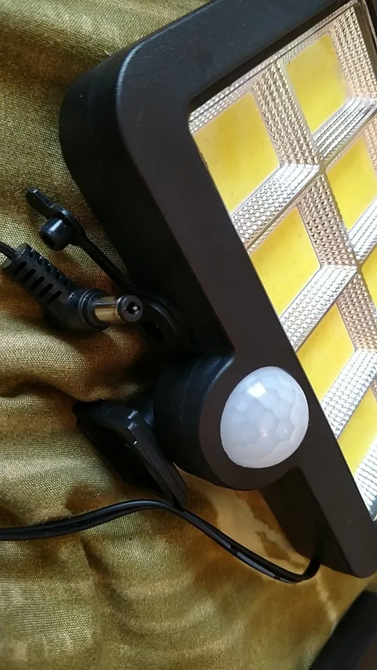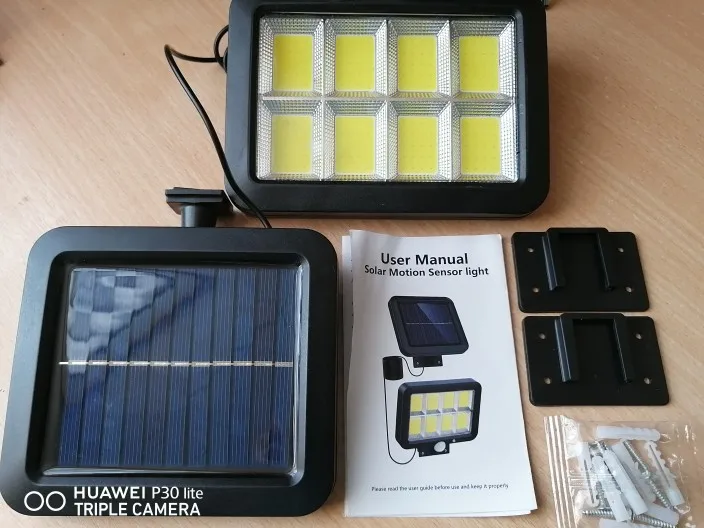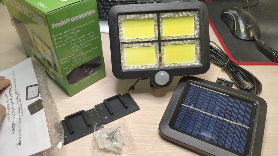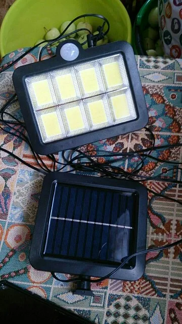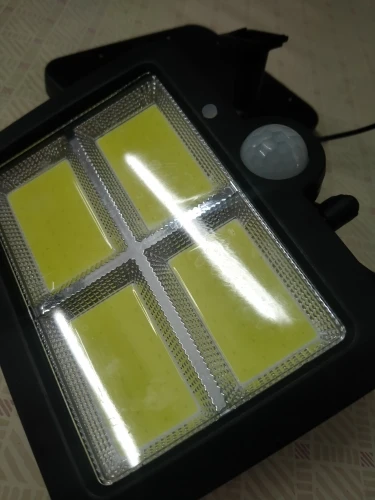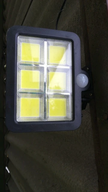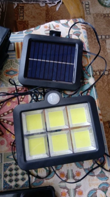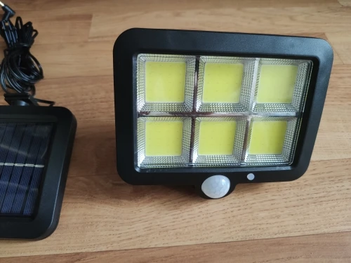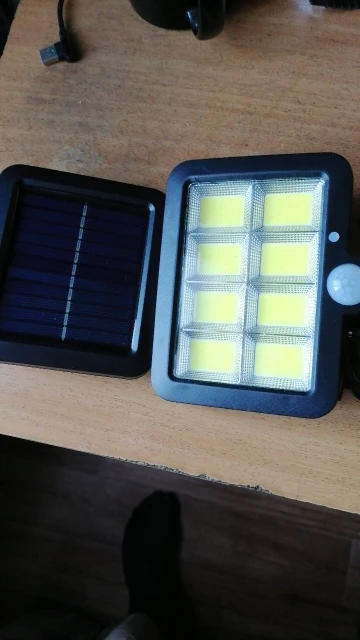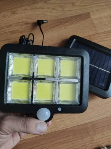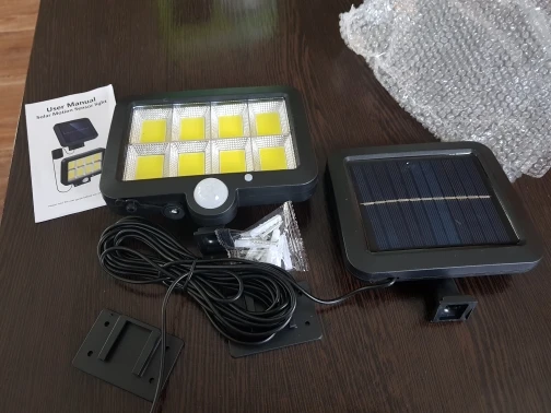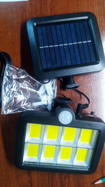 Прожектор работает. Есть датчик движения и выключение по освещённости при подключении солнечной батареи, несколько режимов яркости. Модель на 120 led светит не очень ярко, но достаточно чтобы осветить небольшую рабочую зону или тёмный проход, чтобы не сломать ноги. Доставка очень быстрая, всё пришло целое, не разбитое, спасибо продавцу за двойную коробку и нашей почте, за то что не играли посылкой в футбол!