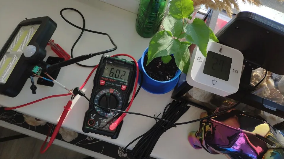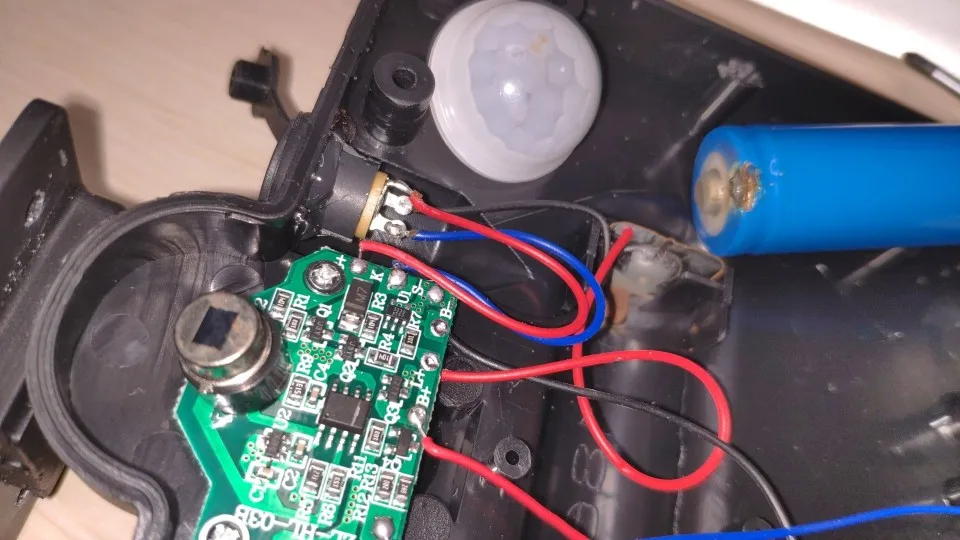 лампа работает, но приехала с убитым аккумулятором, и не хотела работать, продавцу написал об этом, он ответил что бы я тогда открывал спор и возвращал ему товар, я сам разобрал фонарь, и поменял батарею, хорошо такая была, и сам фонарь мало защищён от воды, где стекло были щели, и где датчик движения тоже, всё щели залил герметиком, сейчас хоть под водой с ним ходить, вода точно не попадёт внутрь, и солнечная панель не очень, на солнце выдаёт 5 вольт, но ток маленький, всего около 100милиампер, с таким током батарею на 2000милиампер он будет заряжать часов 20, или больше, светит не сильно ярко, но хватает чтобы осветить дорожку, и когда батарея подразрядится, то начинает глючит датчик движения, то сам срабатывает, то не хочет, я думаю нужно делать отдельное питание вместо батареи и солнечной панели, тогда будет светить ярче, и датчик не будет глючить.
