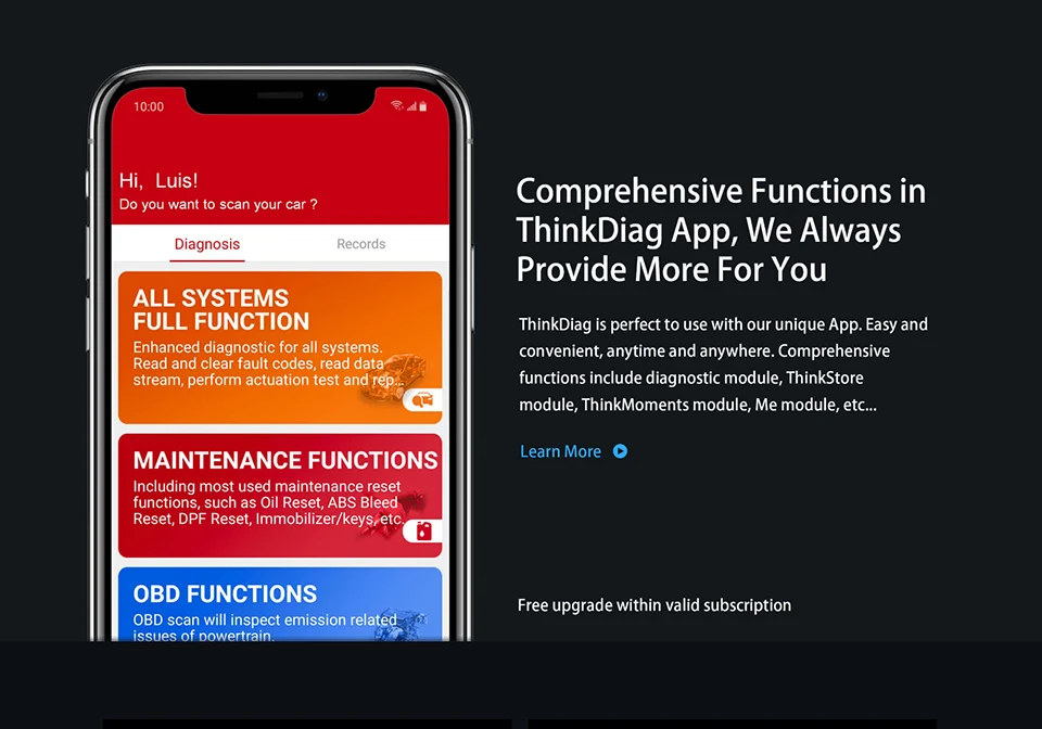 ThinkDiag идеально подходит для использования с нашим уникальным приложением. Легко и удобно, в любое время и в любом месте. Комплексные функции включают диагностический модуль, модуль ThinkStore, модуль ThinkMoments, модуль Me и т. д.